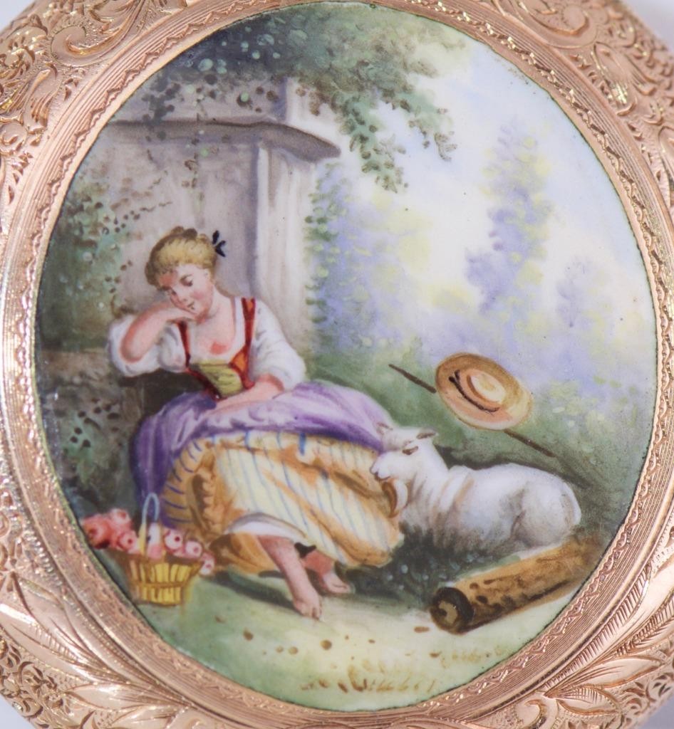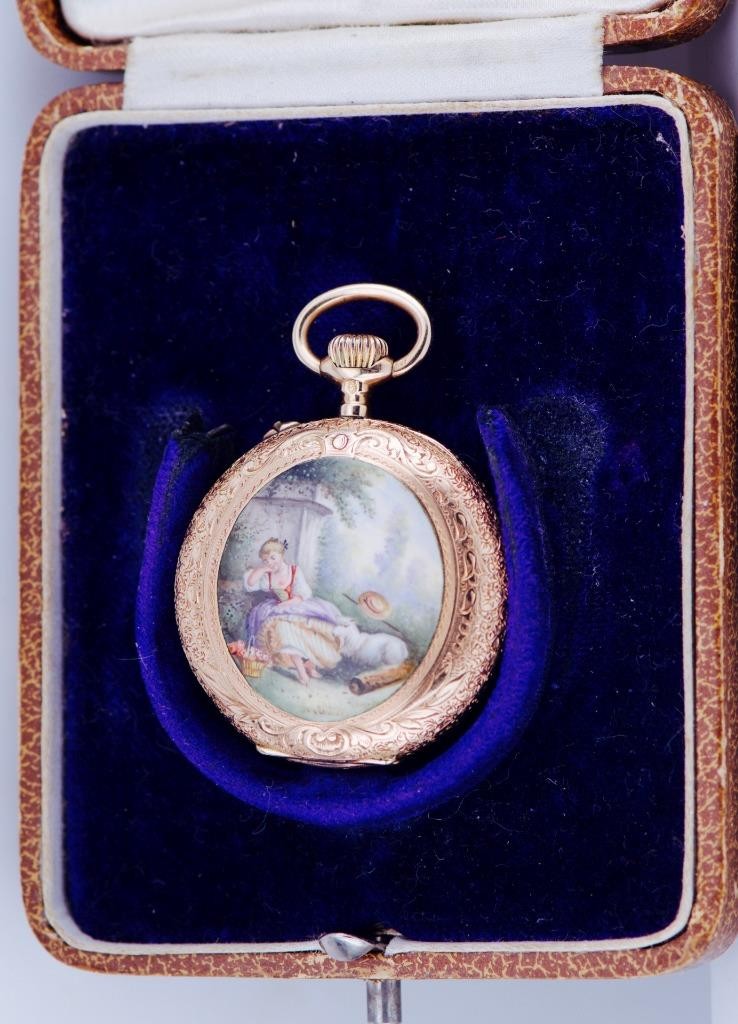 I am pleased to offer from my private collection this exceptionally rare antique14k solid gold and hand painted enamel pocket watch in excellent/mint condition c1900’s.
