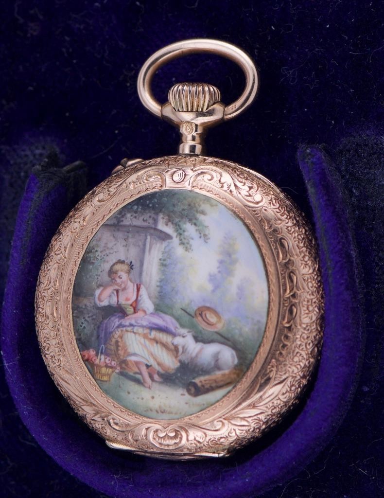 The watch has an amazing hand engraved solid gold case decorated with hand painted enamel. High grade movement,fully jewelled. Perfect working order.