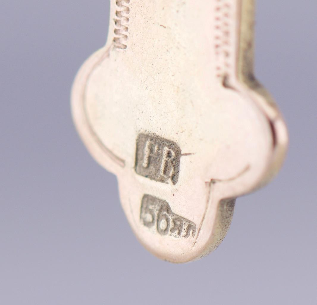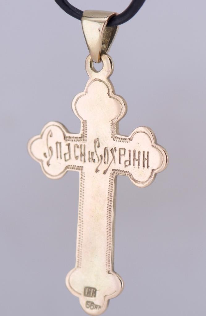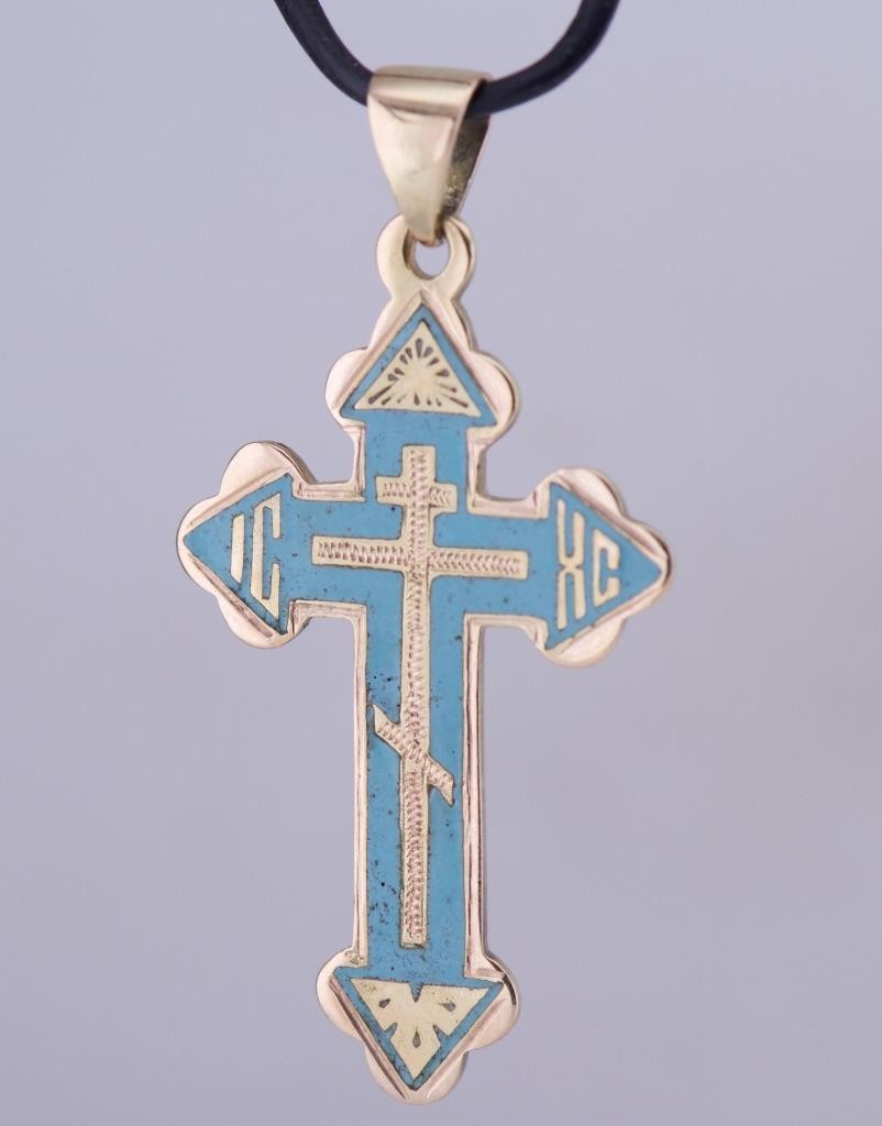 I am pleased to offer from my private collection this rare and beautiful antique Imperial 14k gold Orthodox cross pendant, dating to the circa 1880s. The cross features a striking turquoise blue enamel design with intricate detailing and a finely engraved border. The reverse is inscribed in Cyrillic with the traditional protective phrase “Спаси и Сохрани” (Save and Protect), expressing a blessing of divine safeguarding. The pendant bears the 56 zolotnik gold hallmark (equivalent to 14k) along with the maker’s initials, confirming its authenticity and origin from a distinguished 19th-century workshop. Features • Material: Solid 14k gold (56 zolotnik) • Decoration: Hand-applied turquoise enamel • Inscription: “Save and Protect” (in Cyrillic, hand engraved) • Era: c.1880s • Hallmarks: 56 gold standard, maker’s initials • Condition: Excellent antique condition with only minor enamel wear consistent with age Historical Context In the late 19th century, such finely crafted crosses were worn not only as religious symbols but also as protective talismans. They were frequently gifted to mark significant life events—baptisms, weddings, or other milestones—and were treasured family heirlooms. The high-quality enamel work and gold purity signify it was originally made for a person of means and devotion. Dimensions • Height 37 mm • Weight: 3.7g A superb example of 19th-century ecclesiastical jewelry, combining historical significance, artistry, and faith. A rare find for collectors and connoisseurs of antique devotional artifacts.