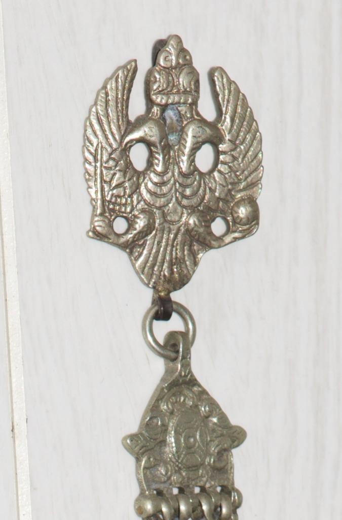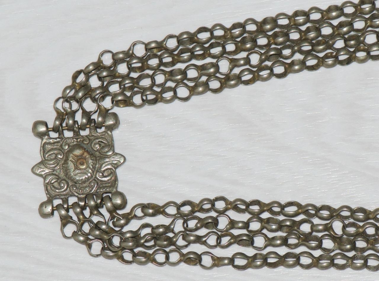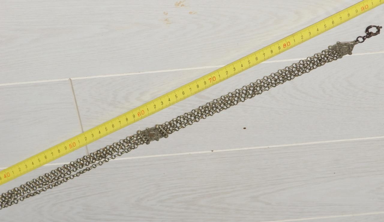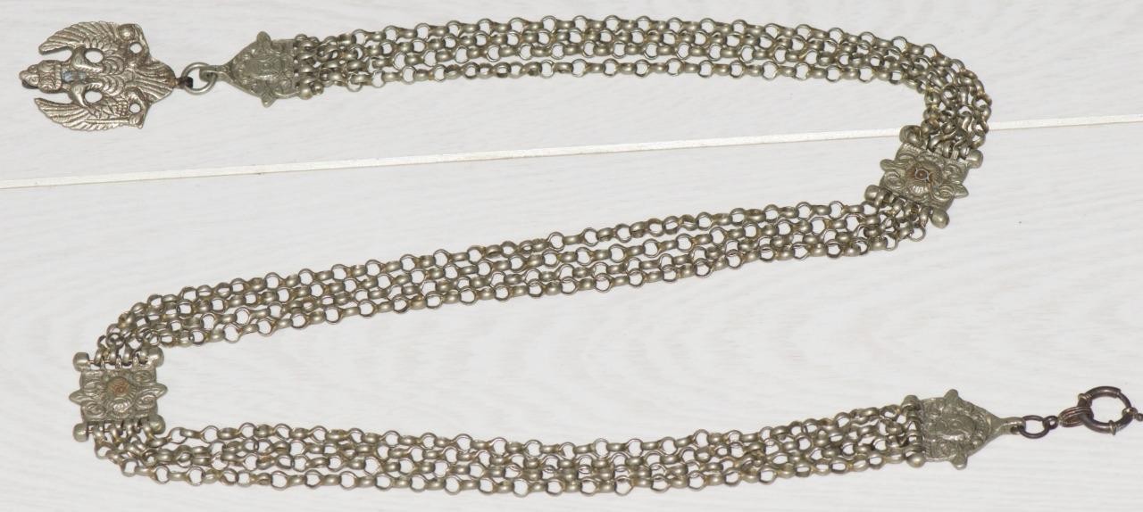 I am pleased to offer from my private collection this Antique 19th Century Imperial Silver Pocket Watch Chatelaine Chain Fob Length: 90 cm Weight: 163 grams An exquisite and substantial 19th century Imperial silver chatelaine chain fob, beautifully crafted with exceptional detail. The chain features a complex five-strand design of intricately formed links, each secured with ornate connecting panels. The upper section is mounted with a prominent double-headed eagle emblem, symbolizing imperial authority—most likely of Eastern European or Rus influence, suggesting an aristocratic or ceremonial function. Decorative terminals and connecting plates throughout the piece are adorned with repoussé-style motifs, exhibiting mythical or heraldic imagery characteristic of 19th century imperial regalia. The clasp end remains intact and functional, making it a rare, complete example. This impressive 90 cm chain would have originally been worn as a watch fob or ceremonial accessory—most likely by a nobleman or court official. A truly distinguished piece of antique wearable history, remarkable for both its scale and symbolism.