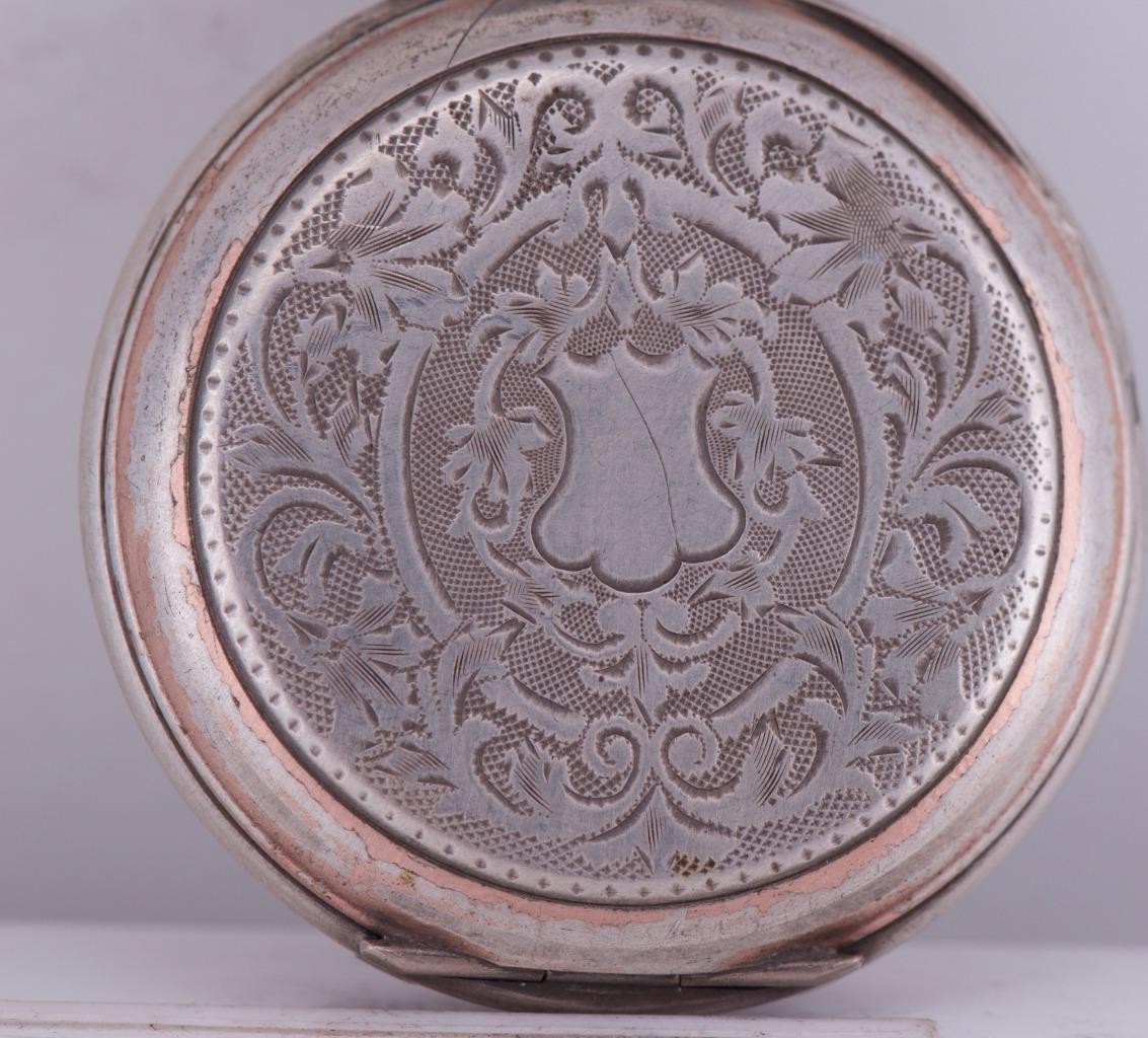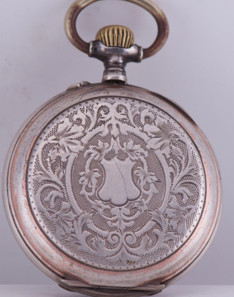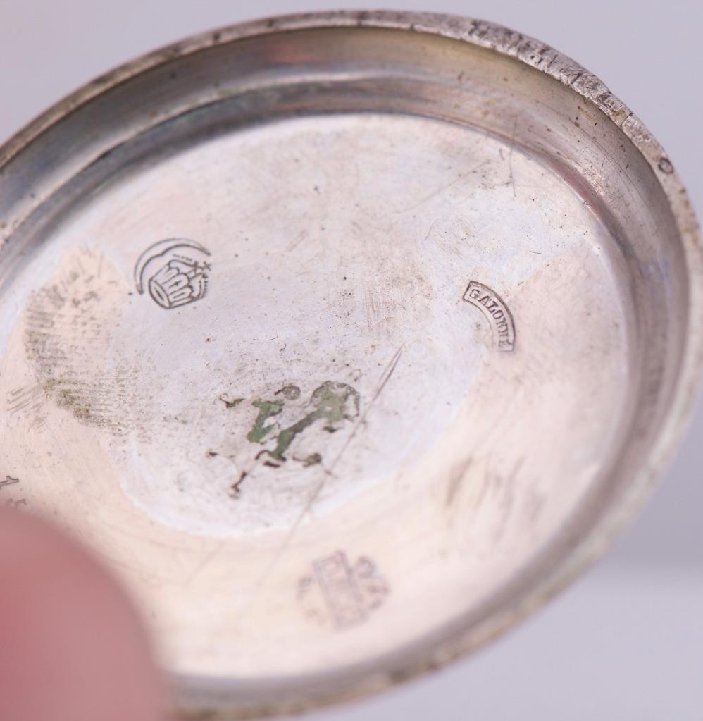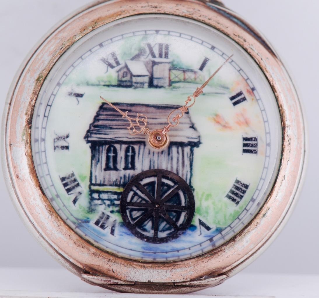 I am pleased to offer from my private collection this remarkable and rare example of early horological artistry, this antique automaton pocket watch features a charming enamel dial depicting a rustic water mill scene, complete with a functional animated waterwheel that moves with the mechanism—a delightful automaton feature designed to bring the dial to life. Key Features: • Dial: Vivid enamel depicting a country watermill, complete with animated rotating waterwheel automaton at 6 o’clock. Roman numerals mark the hours, with finely crafted gilt hands. The artwork shows incredible detail, featuring trees, mill buildings, and flowing water. • Case: Intricately engraved silver case with floral and foliate designs and a blank cartouche, surrounded by a warm gold-filled trim. The back cover displays exceptional repoussé and engine-turned craftsmanship. • Size: Approx. 46mm in diameter, excluding the crown. • Movement: Swiss-made 15-jewel movement, featuring cylinder escapement and manually operated automaton mechanism. Regulator marked Avance / Retard (French for Fast / Slow), indicating Swiss or French production, likely late 19th to early 20th century. • Crown and Bow: Ornate onion-style crown with original bow, typical of continental designs. • Case Marks: Includes hallmark and serial stamps inside the case back indicating Swiss silver standard and manufacturer origin (Garante and other Swiss assay markings). Condition: Well-preserved for its age. Minor wear to the gold-filled trim and some patina to the silver, adding to its antique charm. The automaton wheel mechanism remains visually intact and functional when the movement is wound. This piece is not just a timekeeper but a miniature mechanical artwork—a testament to the golden age of automaton watchmaking and a rare treasure for collectors of animated horology or scenic dials.
