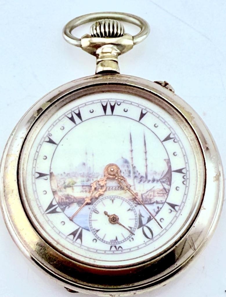 The dial features a fine enamel scene of the Bosphorus, complete with Ottoman-era mosques and minarets, capturing the grandeur of Constantinople (modern-day Istanbul) during the late Ottoman period. Such decorative dials were highly prized status symbols, often presented as gifts or worn as symbols of wealth and prestige.