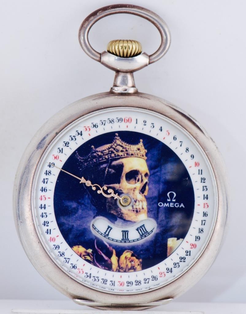 I am pleased to offer from my private collection this rare and fascinating antique Omega pocket watch, crafted in .800 silver, featuring a unique memento mori dial depicting a crowned skull, symbolizing the inevitability of death and the vanity of earthly power. This Gothic-inspired timepiece measures 51mm in diameter and is powered by a high-quality Omega movement in perfect working order. The watch showcases a single hand and a digital hour aperture, a highly unusual and collectible configuration for the early 20th century. The inside of the case bears the Omega hallmark, silver purity mark .800, and the engraved dedication in German: “Trotzdem und alledem” (Nevertheless and in spite of everything) Dated 1909. Item Details • Maker: Omega • Year: 1909 • Case Material: .800 Silver • Diameter: 51mm • Dial: Memento Mori Gothic Skull with Crown, Digital Hour Display • Movement: Manual wind, Omega signed, excellent condition • Condition: Excellent antique condition; fully functional Historical Context – Memento Mori in Horology Memento mori, Latin for “Remember you must die,” was a powerful motif in art and objects from the 16th century onward, reminding individuals of life’s brevity and the inevitability of death. By the late 19th and early 20th centuries, watchmakers occasionally incorporated skulls and Gothic imagery into dials as a philosophical and artistic statement. Omega, a pioneer in precision timekeeping, produced exceptional silver pocket watches during this era. This piece combines their craftsmanship with a profound symbolic design, making it a standout collectible for both Omega enthusiasts and Gothic art collectors. Why Collect This Watch? • Rare memento mori dial with Gothic skull imagery • Unusual single-hand movement with digital hours • Engraved German motto with historical date (1909) • A perfect blend of horology, art, and symbolism An extraordinary addition to any antique watch or memento mori collection.