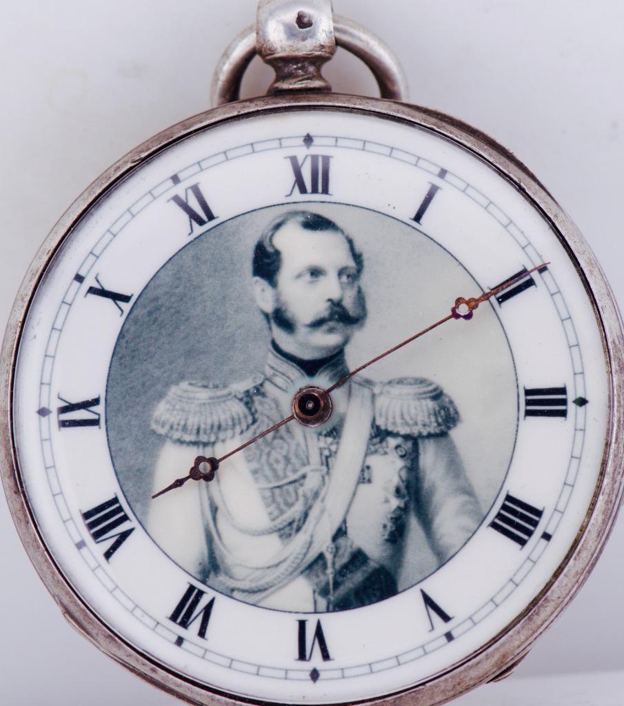 Fine enamel dial depicts a portrait of the Tsar Alexander II. High grade movement.
