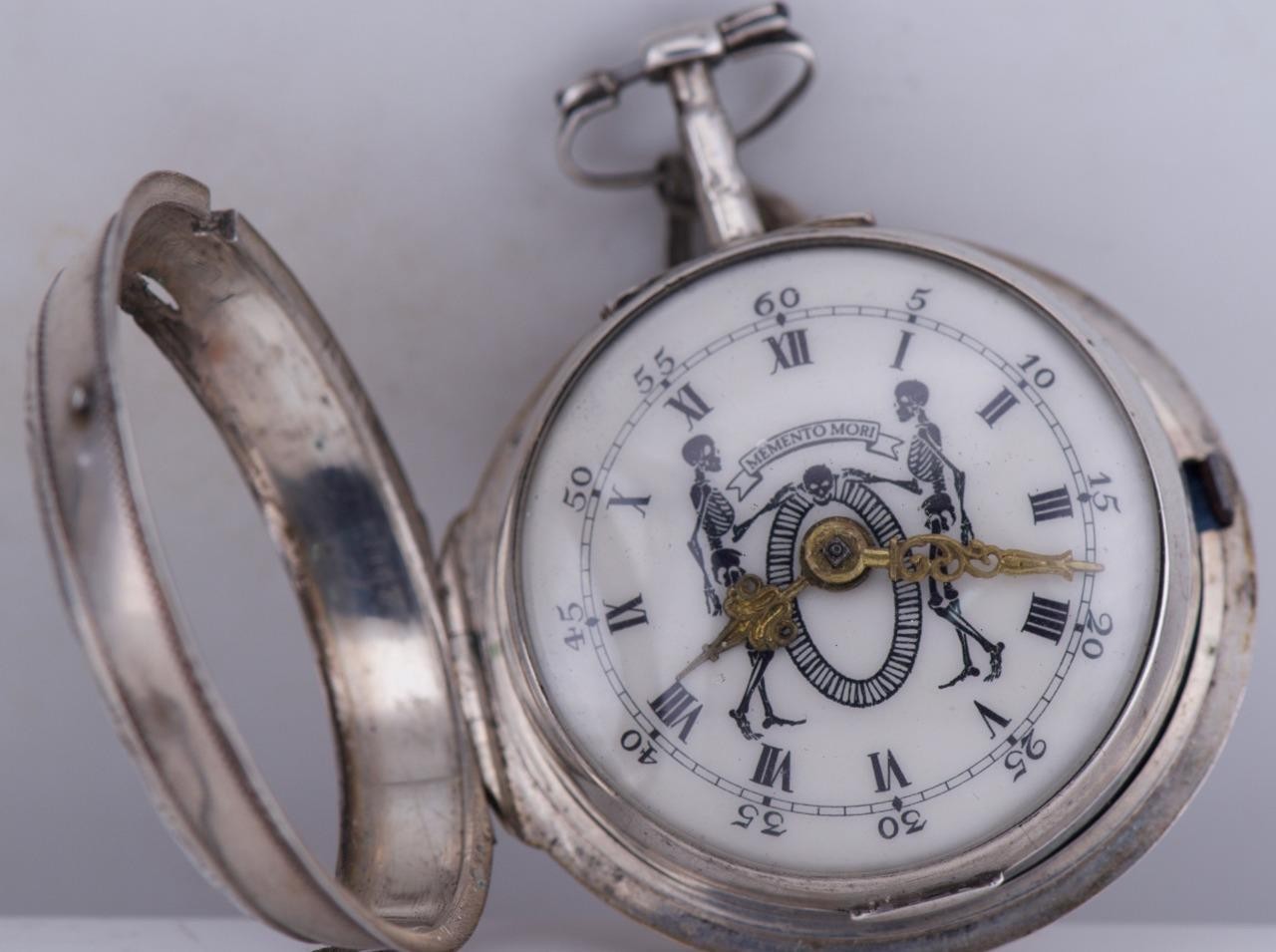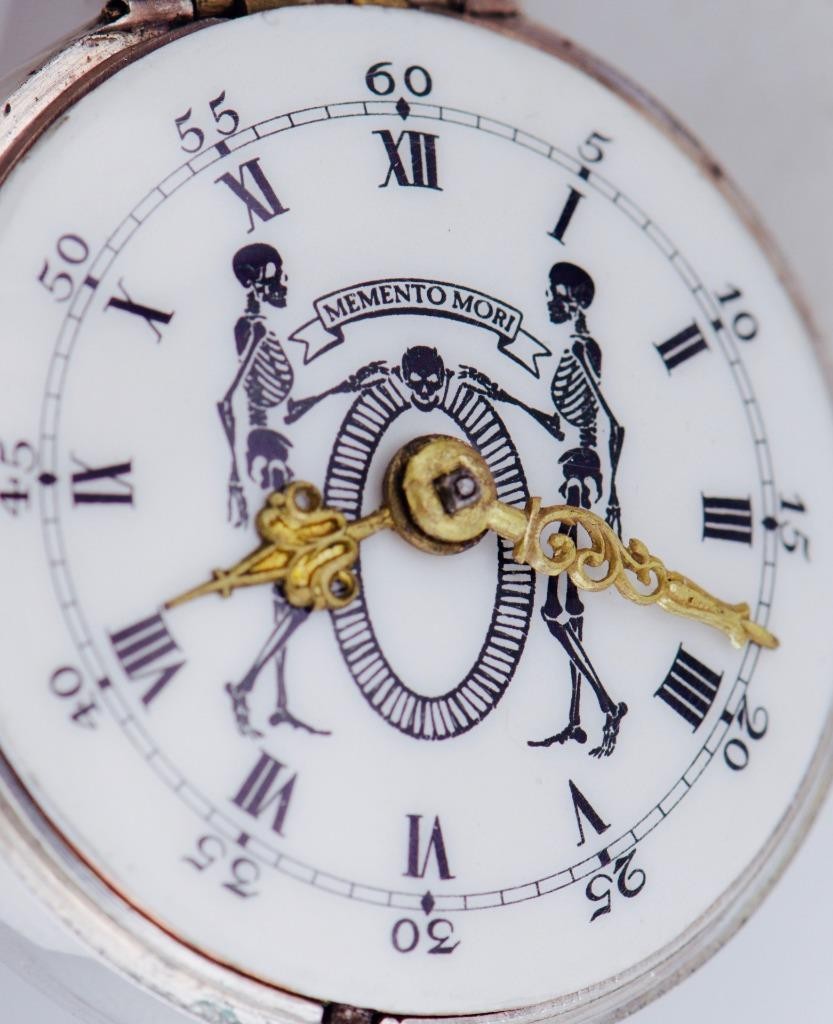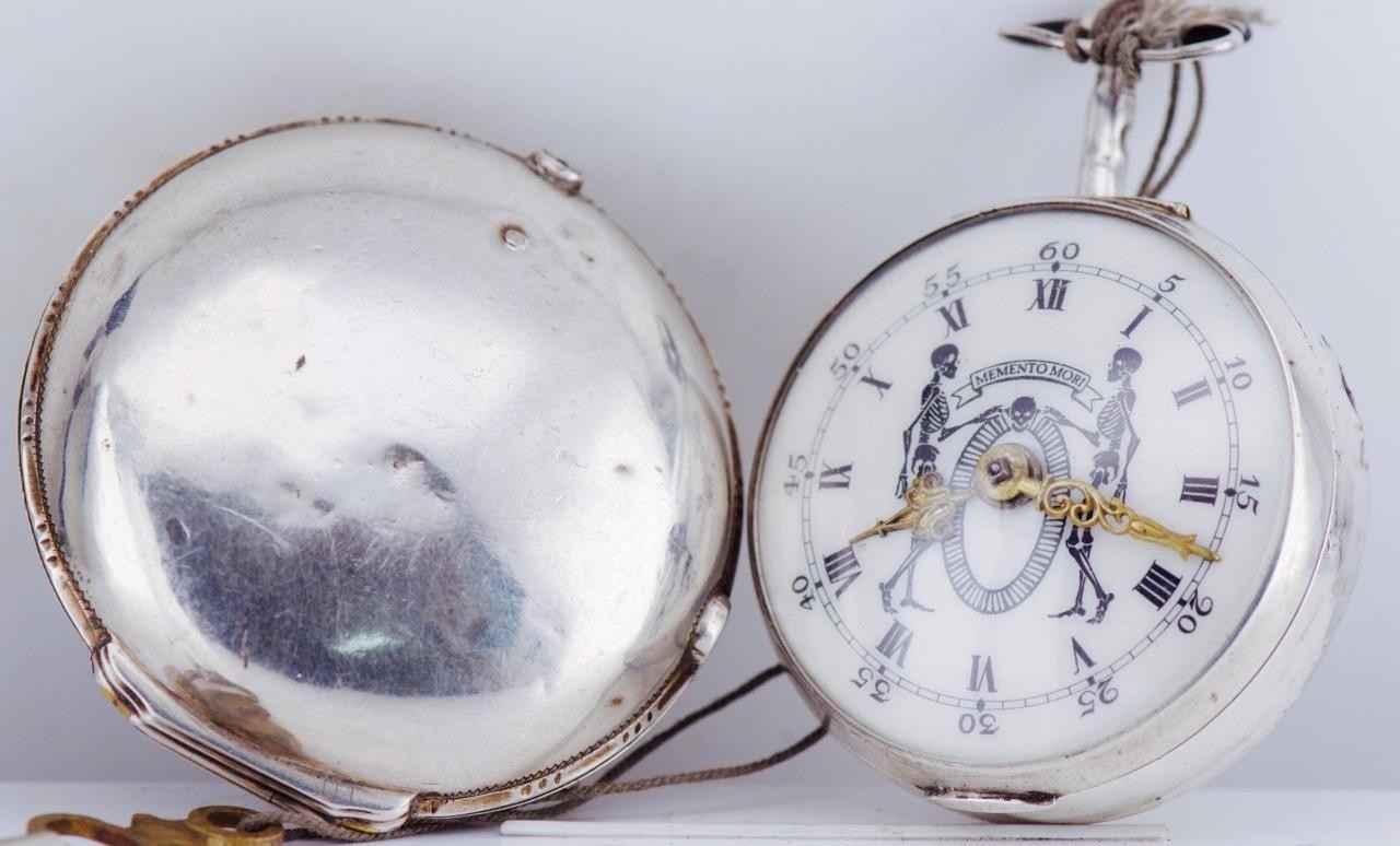 Authentic 18th-century French memento mori pocket watch, dating to circa 1750s, housed in its original pair silver cases. This exceptional example features a rare and striking memento mori dial, depicting skeleton figures with the Latin motto “Memento Mori” — a powerful reminder of mortality, highly sought after by collectors of early horology and vanitas symbolism.