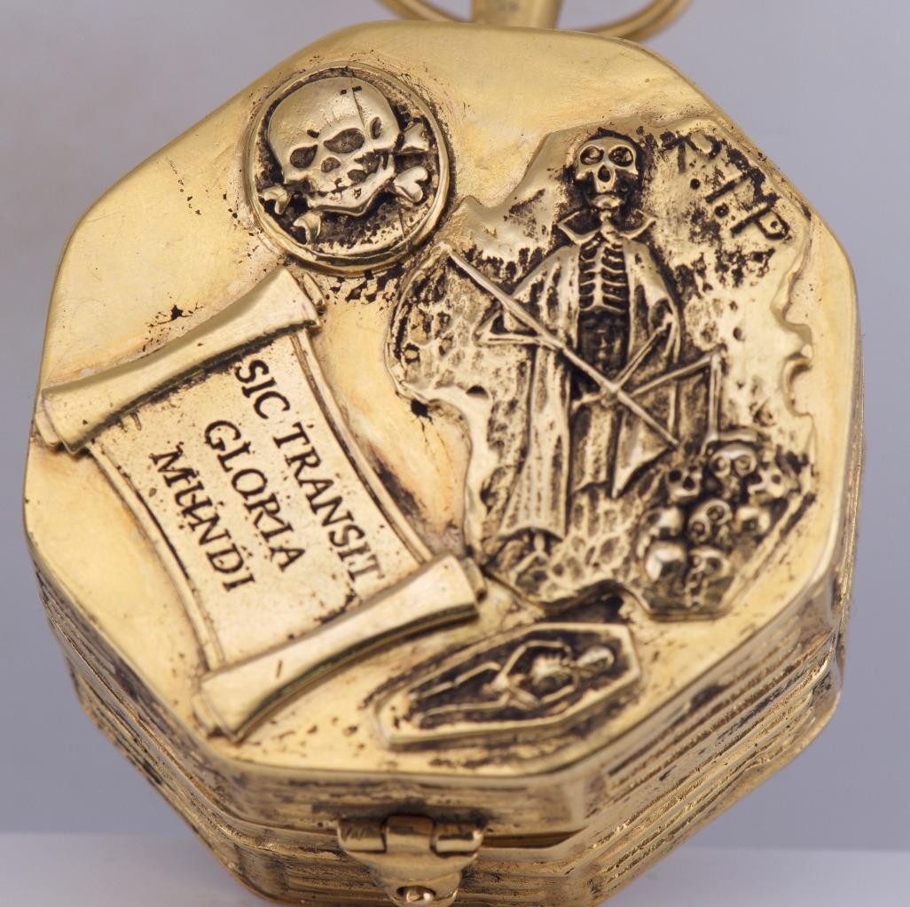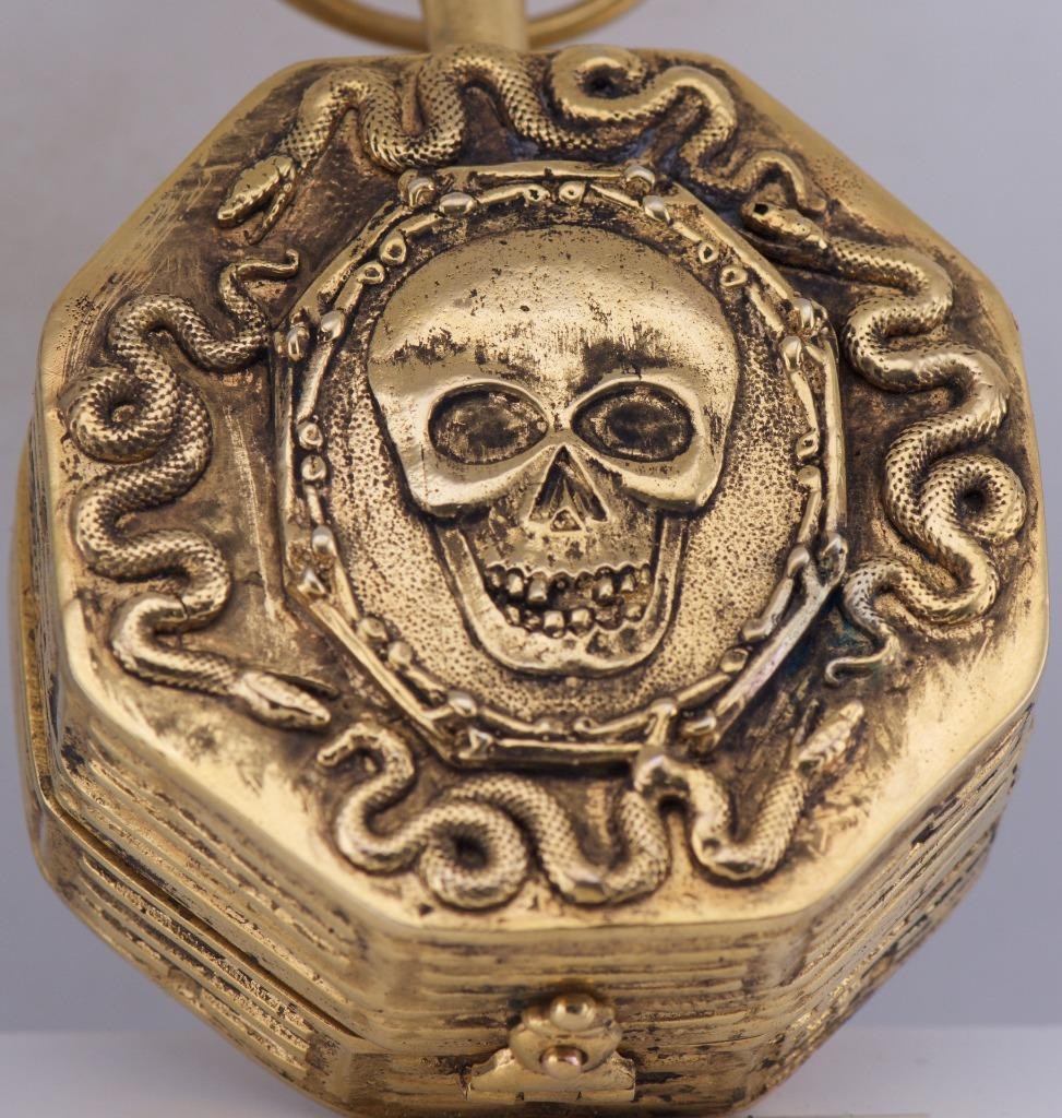 The watch is housed in a gilt bronze (ormolu) chased case, measuring approximately 55 mm, decorated throughout with finely modeled skull, skeleton, serpent, coffin, and funeral motifs—a classic memento mori program reminding the wearer of the transience of life.