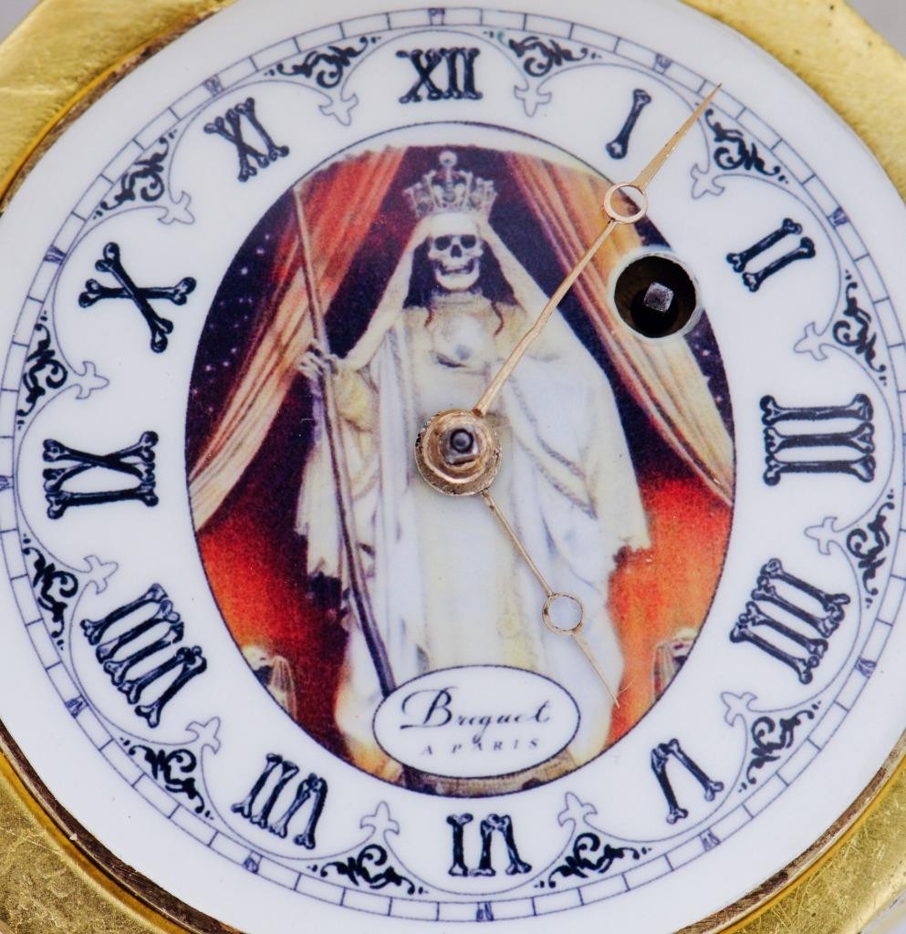 An exceptionally rare and visually striking 18th-century French memento mori pocket watch, signed “Breguet à Paris”, dating to circa 1790’s. This is an extraordinary survival from the Enlightenment era, combining high horology with powerful symbolic artistry focused on vanitas and mortality.