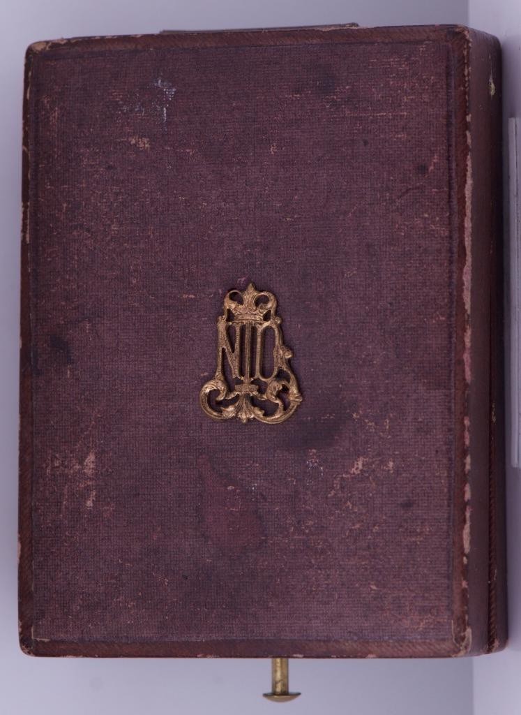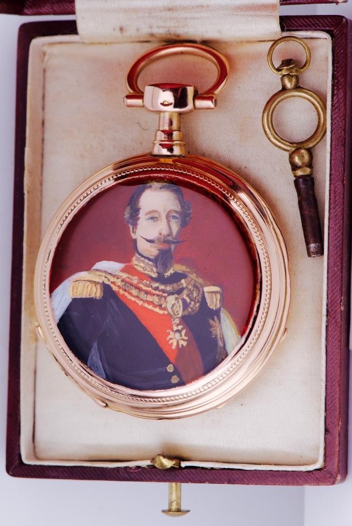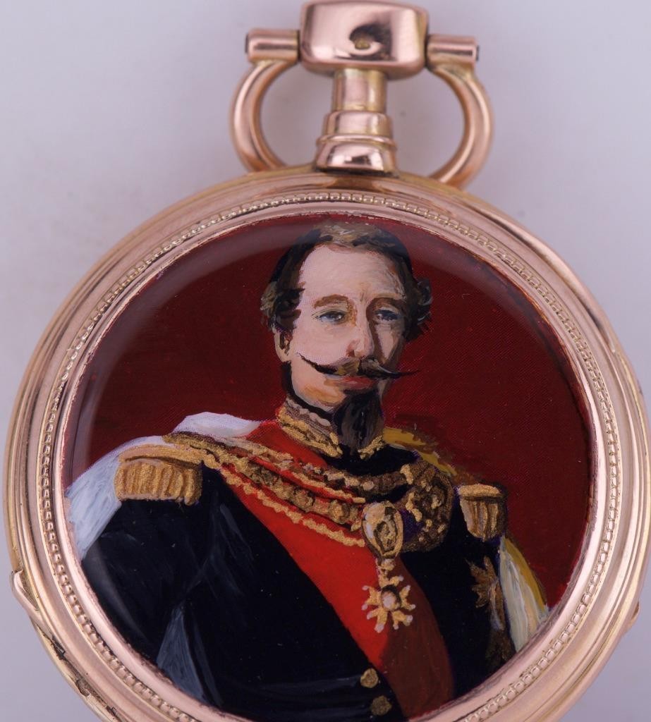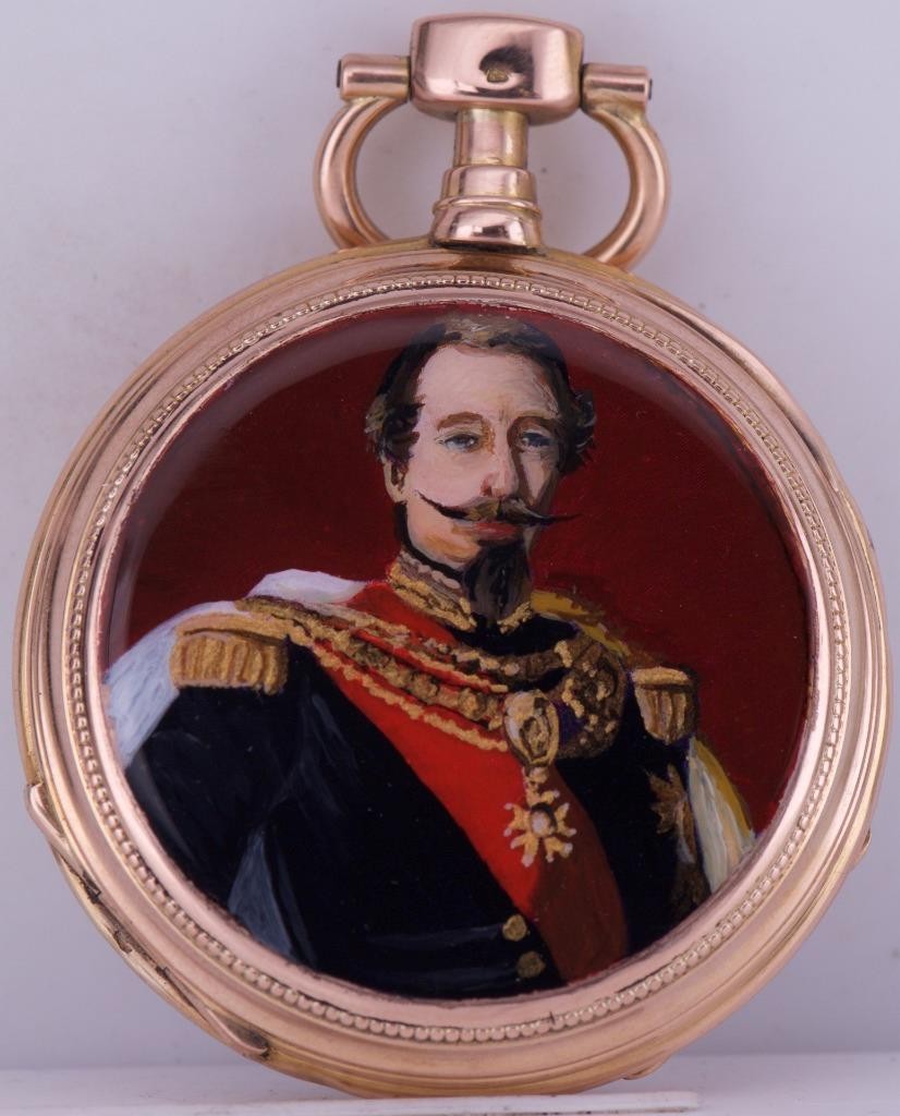 I am pleased to offer from my private collection this rare antique French award 18k solid gold and hand painted enamel pocket watch c1870. The watch is preserved in excellent to mint original condition. It comes with the original luxury presentation box.. Fine enamel dial . The watch has a solid 18k gold open face case depicting a hand painted enamel portrait of the French king Napoleon III.Â