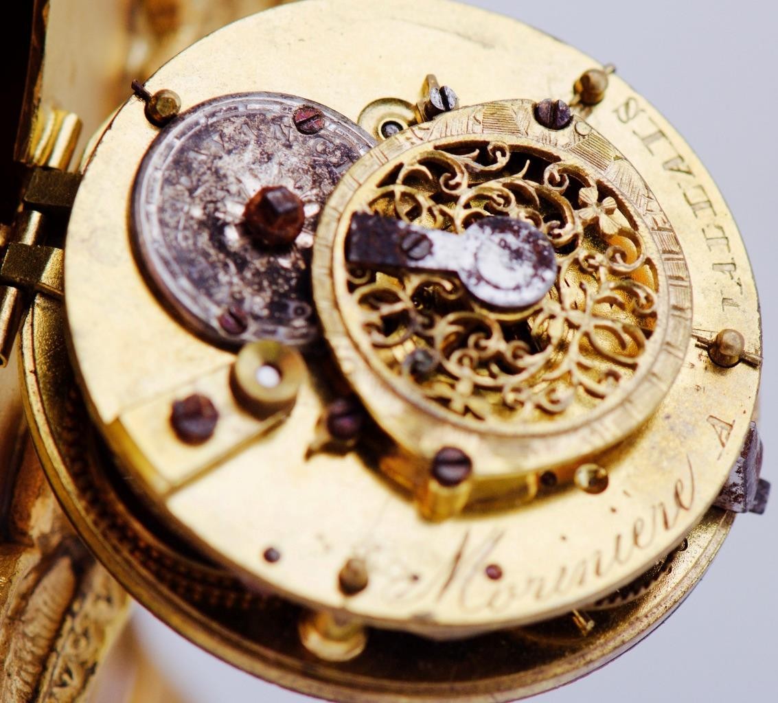 I am pleased to offer from my private collection this rare and highly symbolic early 19th-century French memento mori desk clock, featuring a verge fusee escapement housed in an elaborate gilt bronze case. This macabre yet sophisticated object blends themes of mortality, medicine, and neoclassical artistry—crafted as a profound reminder of life’s transience and the solemn responsibility of the medical profession. Design Features: • Memento Mori Skull & Crown: Atop the case sits a crowned skull, signifying the sovereignty of death and the humility of human life. • Engraved Skeleton Motif: One side of the case displays a delicately engraved full human skeleton—an anatomical nod to the doctor’s understanding of the human body. • Engraving (Back): The back bears an engraved passage from the Hippocratic Oath, written in Greek, and dated Paris 1809, anchoring it firmly in the medical and philosophical traditions of the time. • Dial: Enamel dial with Roman numerals, signed “Moriniere à Jallais”, indicating a regional French maker. • Movement: Exposed verge fusee escapement visible when opened, with decorative gilded balance cock and fine detailing. • Construction: Hinged case with rich baroque and rococo ornamentation, reflecting the aesthetic tastes of Napoleonic-era France. Specifications: • Maker: Moriniere à Jallais (France) • Date: Circa 1809 • Material: Gilt bronze • Movement: Early verge fusee, key-wound • Dial: White enamel with Roman numerals • Engravings: Greek Hippocratic Oath, Paris 1809 • Dimention: 10.8cm high. Condition: Good antique condition with typical signs of age. Some minor wear and discoloration to the enamel dial. Movement appears complete but untested. Case gilding is well preserved with fine detailing throughout. Historical Significance: This piece would have likely belonged to a physician or scholar of the early 19th century, intended as a daily reminder of the sacred duty to heal and the inevitability of death. The use of Greek inscription for the oath and the date 1809 Paris suggests a classical influence prevalent during the Enlightenment and Napoleonic era. Remarks: A highly collectible and intellectually rich object at the crossroads of medicine, horology, and memento mori art. Ideal for collectors of verge fusee timepieces, medical antiques, or symbolic decorative arts.