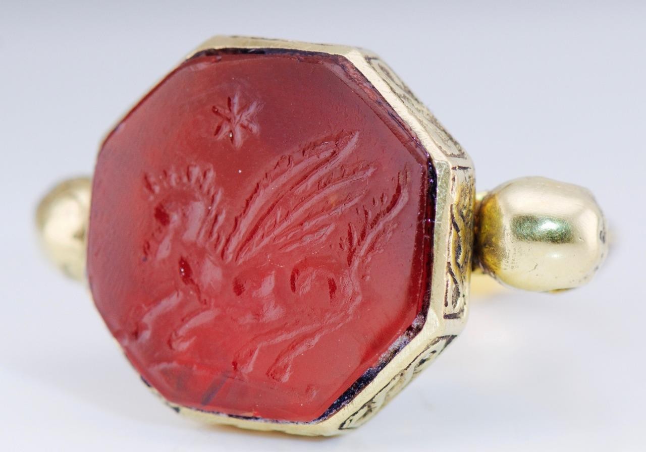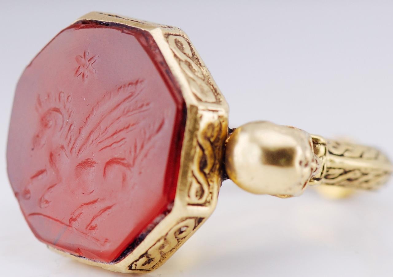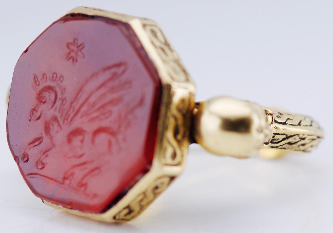 The ring is set with a beautiful octagonal Carnelian intaglio, engraved with a winged mythical creature beneath a star motif, all cut by hand in the traditional manner. The mount is heavily decorated with scrolling Georgian patterns, still retaining traces of its original darkened detailing.