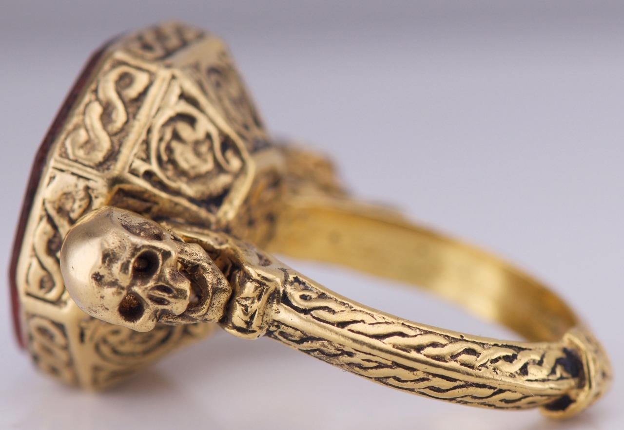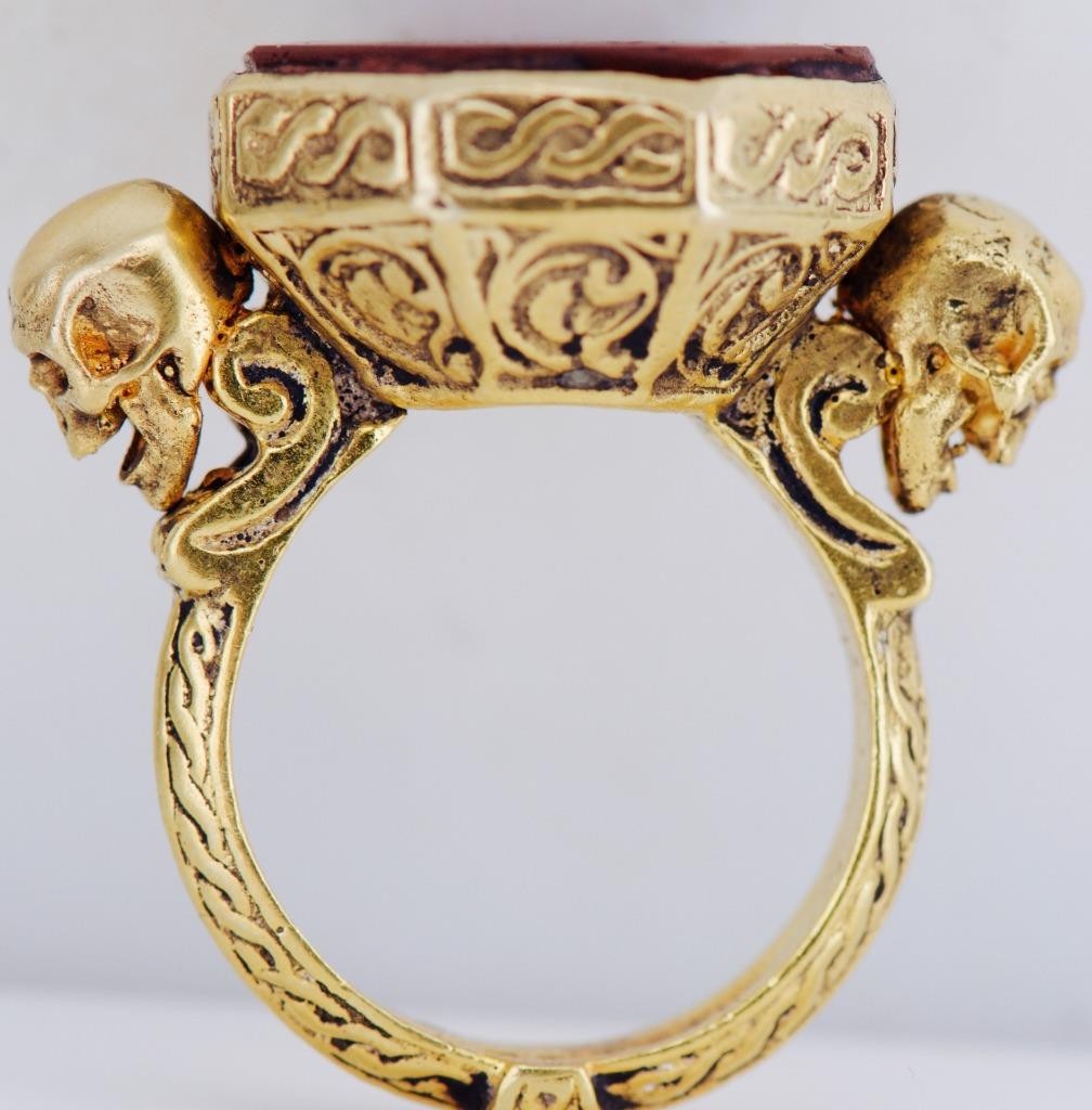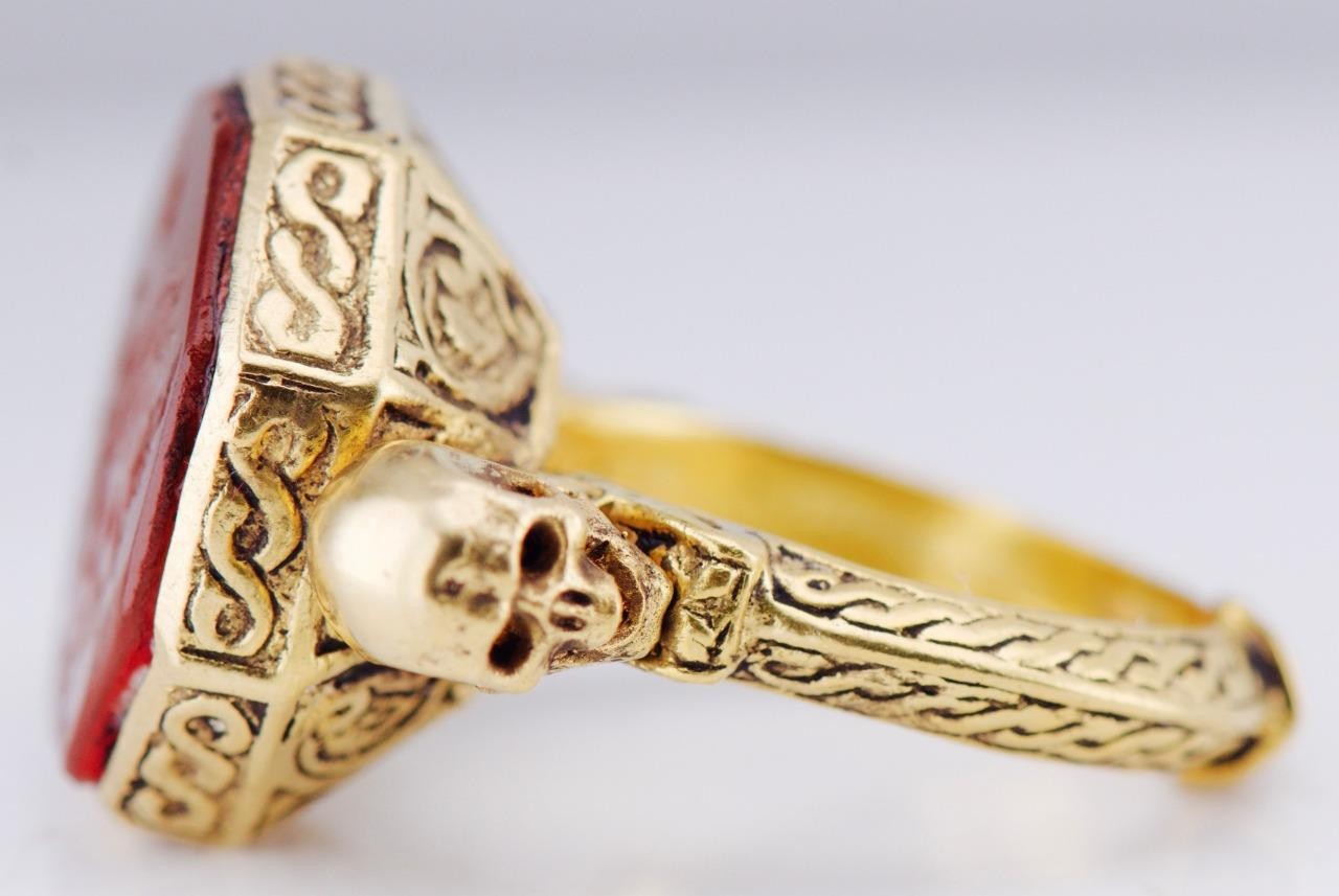 A highly collectible and wearable antique, especially desirable for collectors of memento mori, skull jewelry, Georgian intaglios, and early vermeil rings.