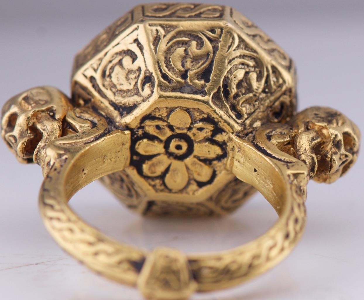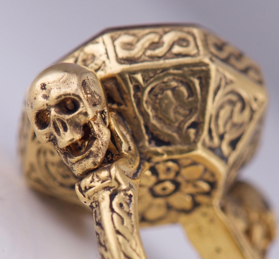 A rare and striking Georgian-era memento mori ring, crafted in 18k gilt sterling silver (vermeil) and featuring extraordinary hand-engraved decoration throughout.