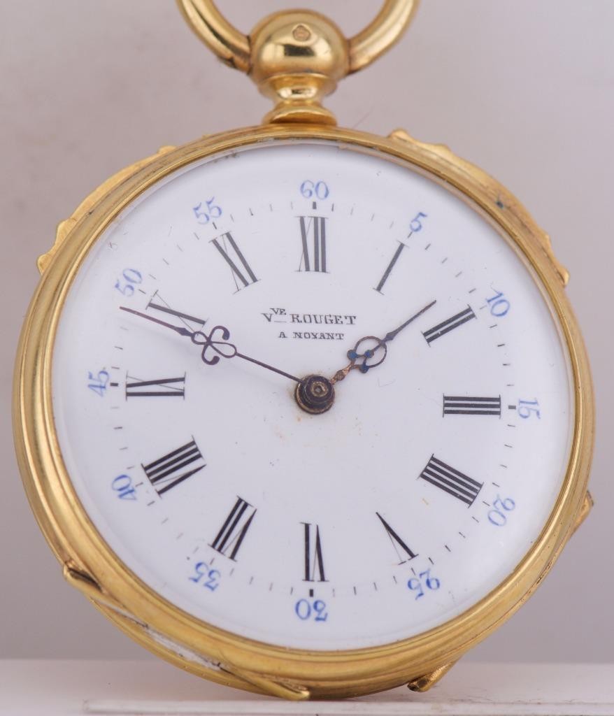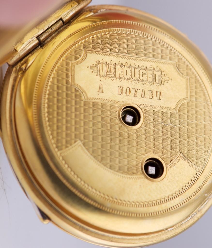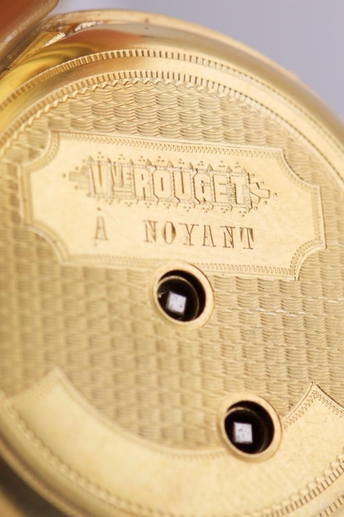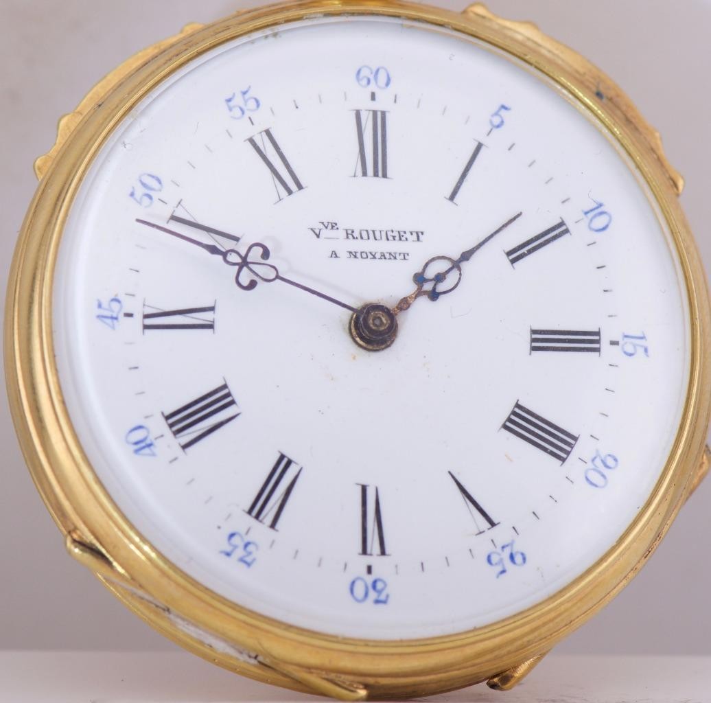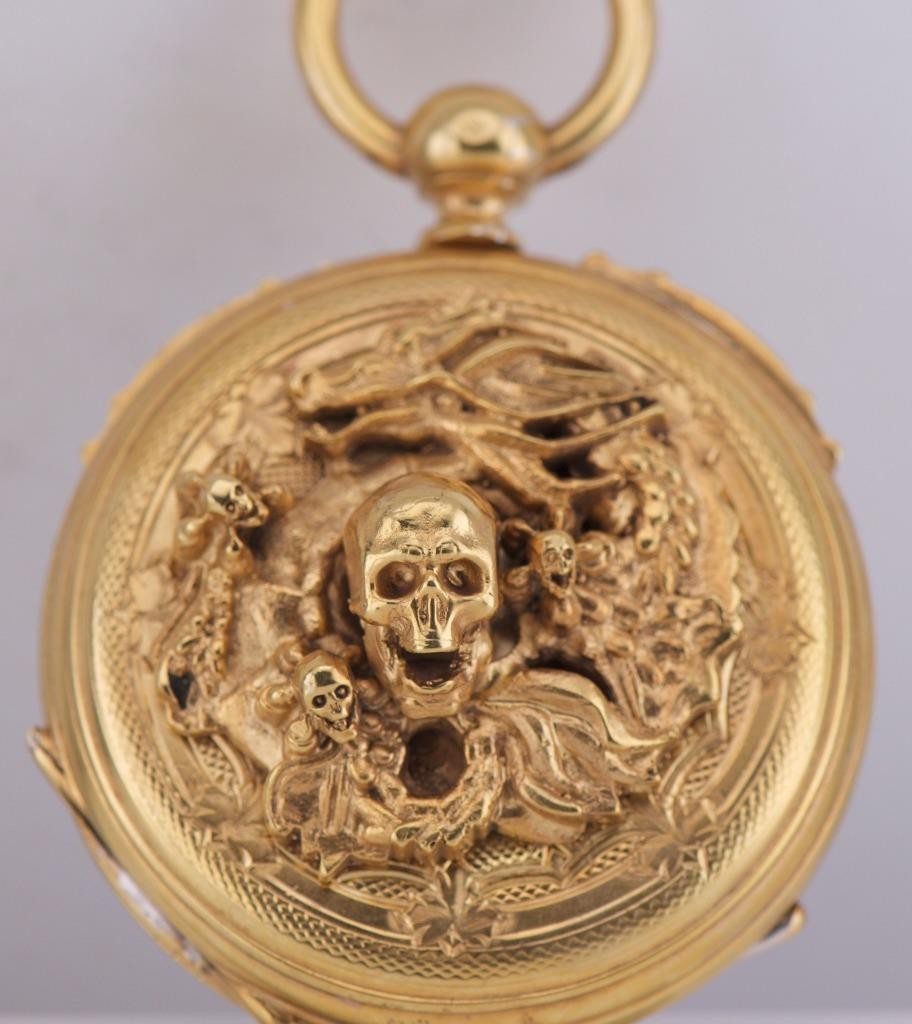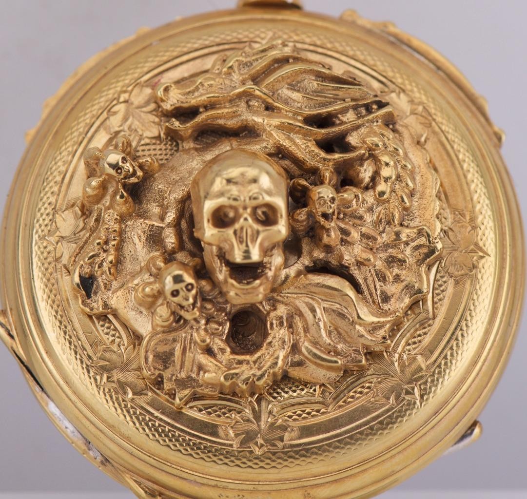A Masterpiece of 19th-Century Macabre Horology . We are exceptionally proud to offer an incredibly rare, museum-quality antique French Memento Mori skull pocket watch made by V.Rouget a Noyant, dating to the circa 1860s. Finding a Memento Mori timepiece of this age and caliber is an event in itself, but finding one in such pristine condition, completely adorned in hand-chased motifs , makes this a once-in-a-lifetime acquisition for the serious horology or esoterica collector.