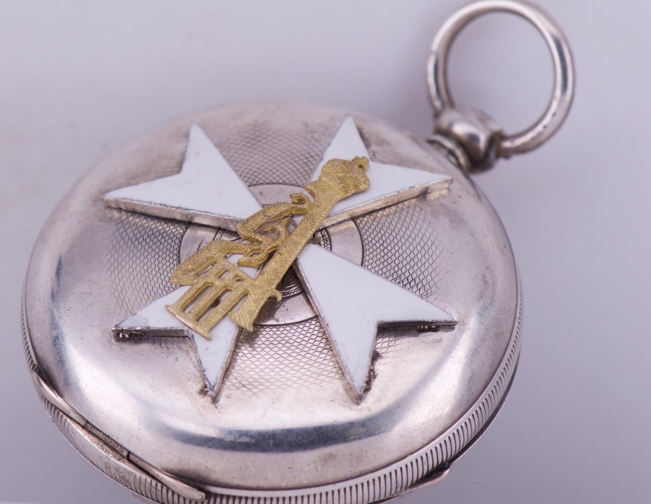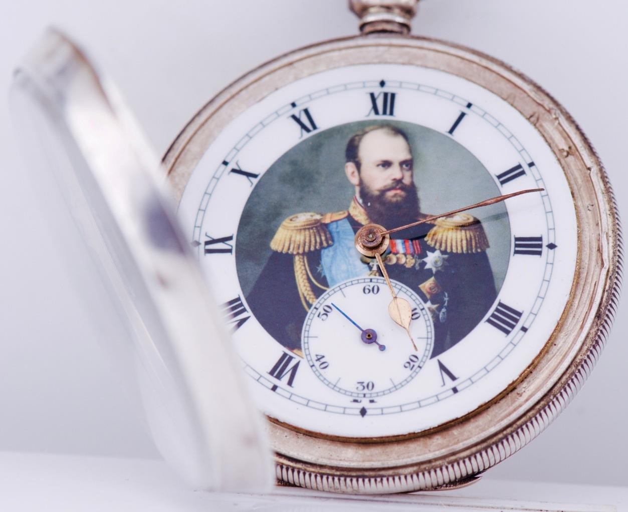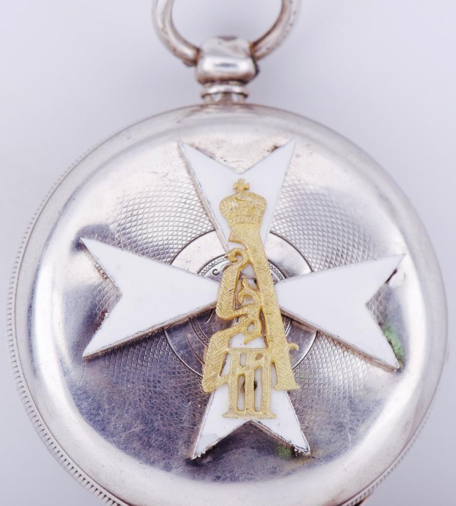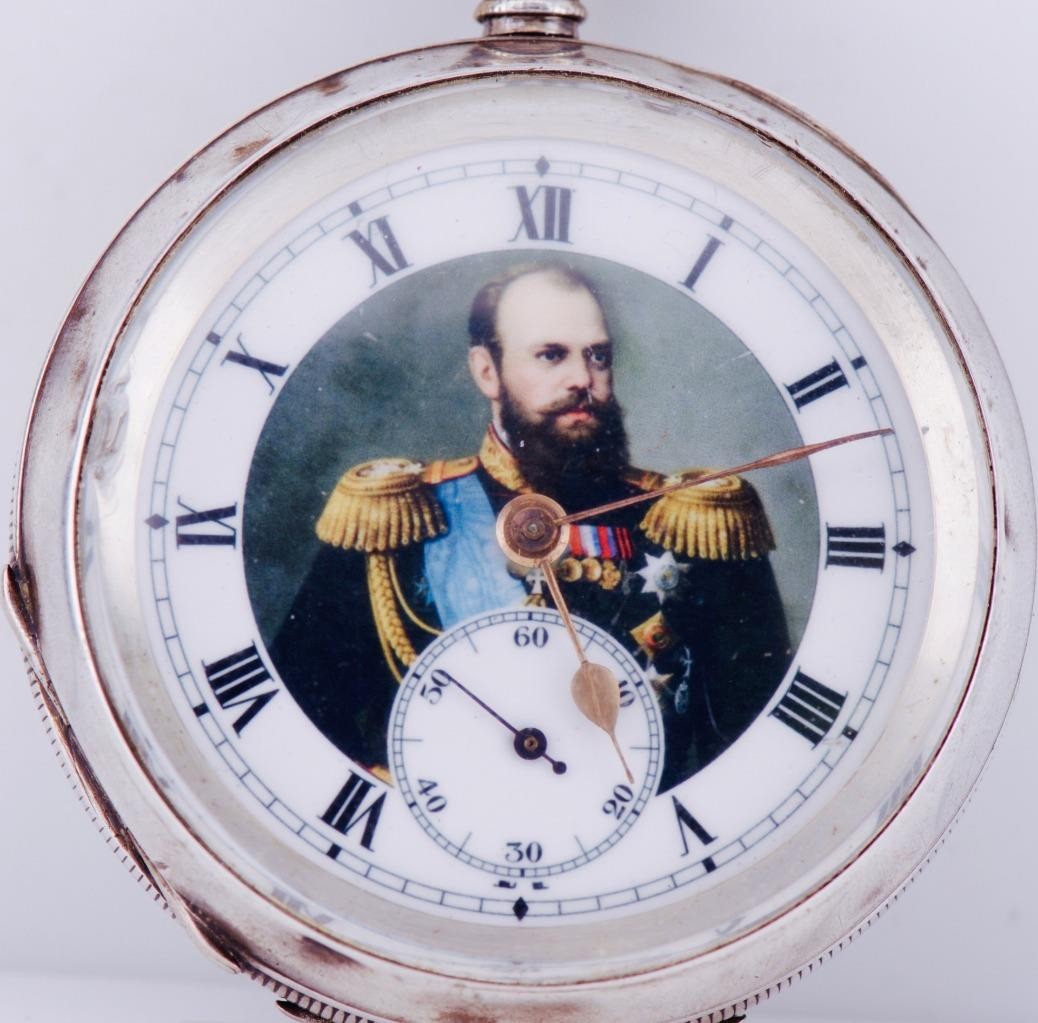 I am please to offer from my private collection this rare antique Imperial Russ Tsar’s Era Sterling Silver Pocket Watch c1883. Fine enamel dial depicting portrait of Tsar Alexander III. Heavy sterling silver case depicting the royal monogram of Tsar Alexander III in the middle of enamelled order.