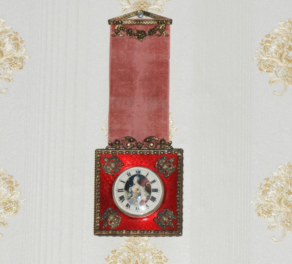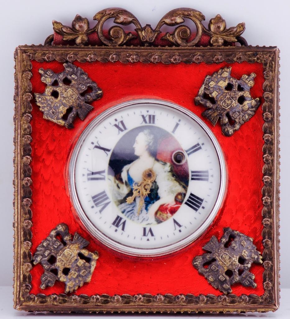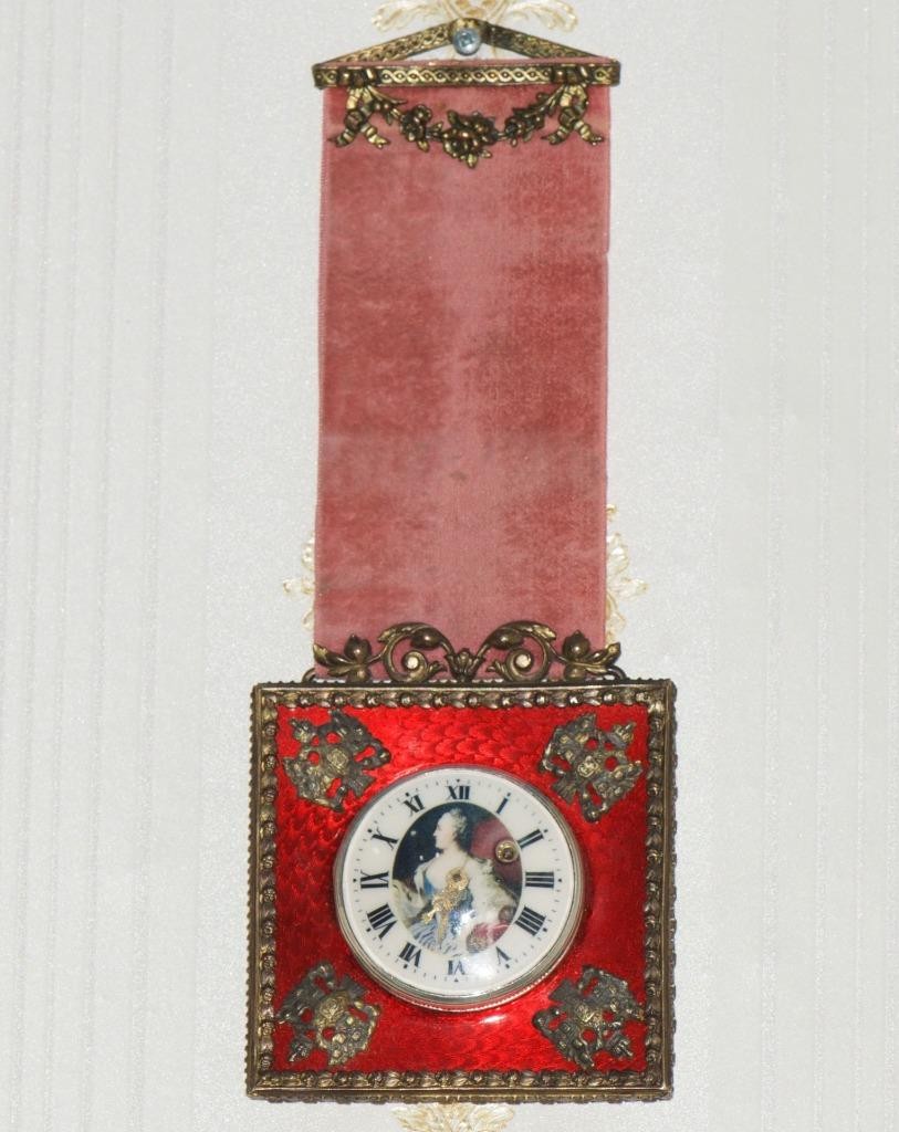 I am pleased to offer from my private collection this exquisite antique traveler carriage Verge Fusee clock is a rare collectible from the late 18th century, circa 1790s. It features a stunning combination of craftsmanship and imperial history: • Case Material: Bronze with fine enamel accents and a silver frame. • Dial: Beautifully crafted enamel dial with Roman numerals, depicting an elegant portrait of Empress Catherine II (Catherine the Great). • Design: A luxurious red enamel body with intricate bronze details and floral motifs. Velvet back enhances its regal appearance. • Condition: The clock retains much of its original charm. The enamel and bronze detailing are well-preserved, with minor wear consistent with age. The glass cover is intact and functional. The clock comes with the original velvet ribbon which allow to hang it on the wall. •  Movement: Fine fire gilt verge fusee movement,made by the french watch master Clement a Paris. Hand engraved and pierced balance cock. It comes with a matching winding key. A superb addition for collectors of imperial memorabilia, antique timepieces, or historical art. Don’t miss the chance to own this remarkable piece of history! Shipping: Secure packaging and insured shipping offered worldwide. Price: Open to reasonable offers. Feel free to reach out with any questions or for additional photos.