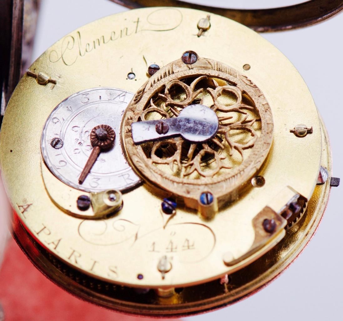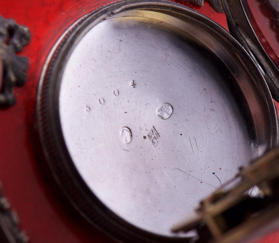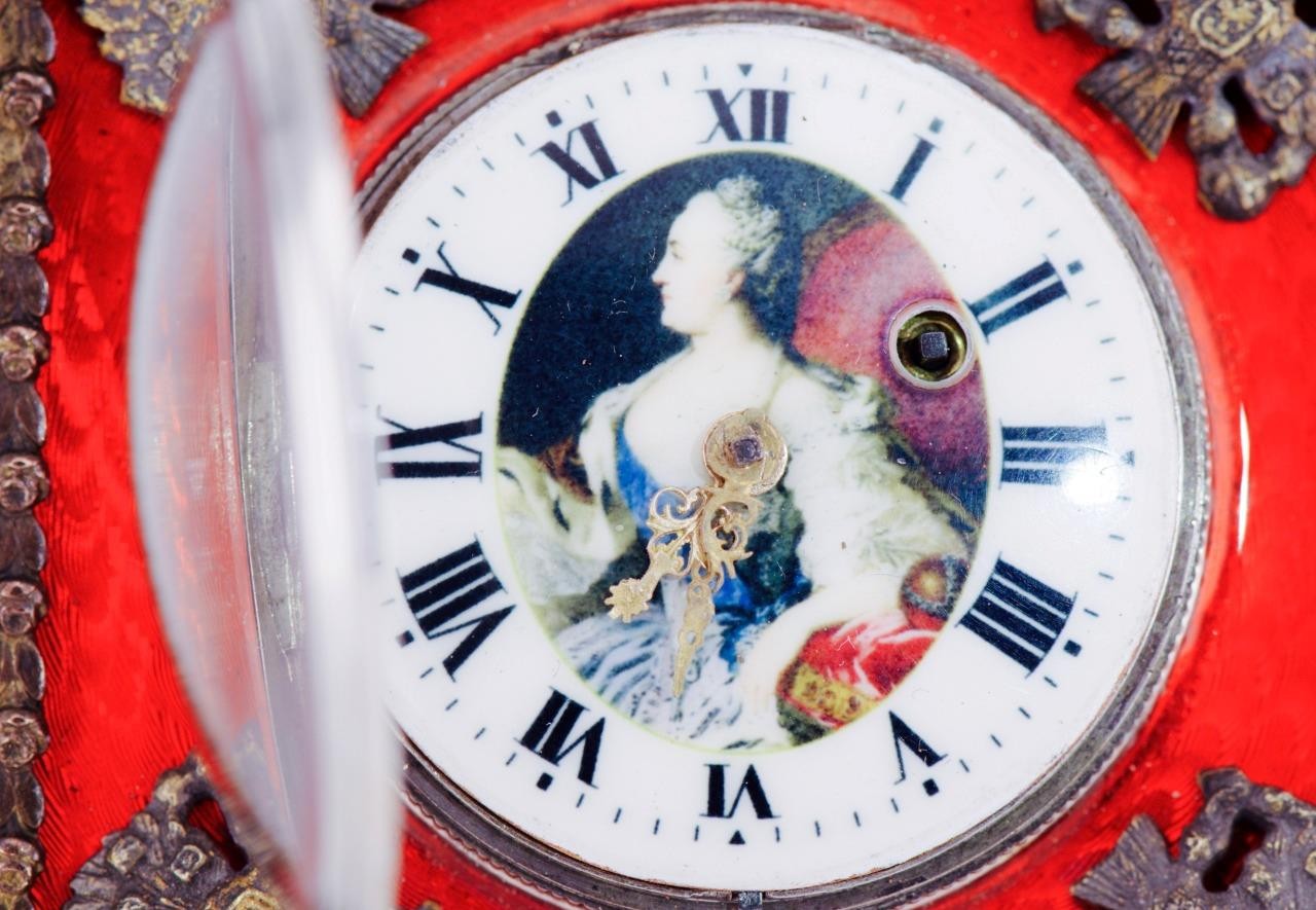 I am pleased to offer from my private collection this exquisite antique traveler carriage Verge Fusee clock is a rare collectible from the late 18th century, circa 1790s. It features a stunning combination of craftsmanship and imperial history: • Case Material: Bronze with fine enamel accents and a silver frame. • Dial: Beautifully crafted enamel dial with Roman numerals, depicting an elegant portrait of Empress Catherine II (Catherine the Great). • Design: A luxurious red enamel body with intricate bronze details and floral motifs. Velvet back enhances its regal appearance. • Condition: The clock retains much of its original charm. The enamel and bronze detailing are well-preserved, with minor wear consistent with age. The glass cover is intact and functional. The clock comes with the original velvet ribbon which allow to hang it on the wall. •  Movement: Fine fire gilt verge fusee movement,made by the french watch master Clement a Paris. Hand engraved and pierced balance cock. It comes with a matching winding key. A superb addition for collectors of imperial memorabilia, antique timepieces, or historical art. Don’t miss the chance to own this remarkable piece of history! Shipping: Secure packaging and insured shipping offered worldwide. Price: Open to reasonable offers. Feel free to reach out with any questions or for additional photos.