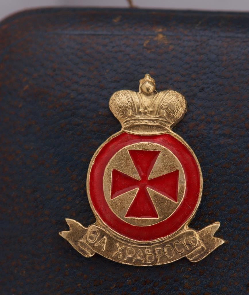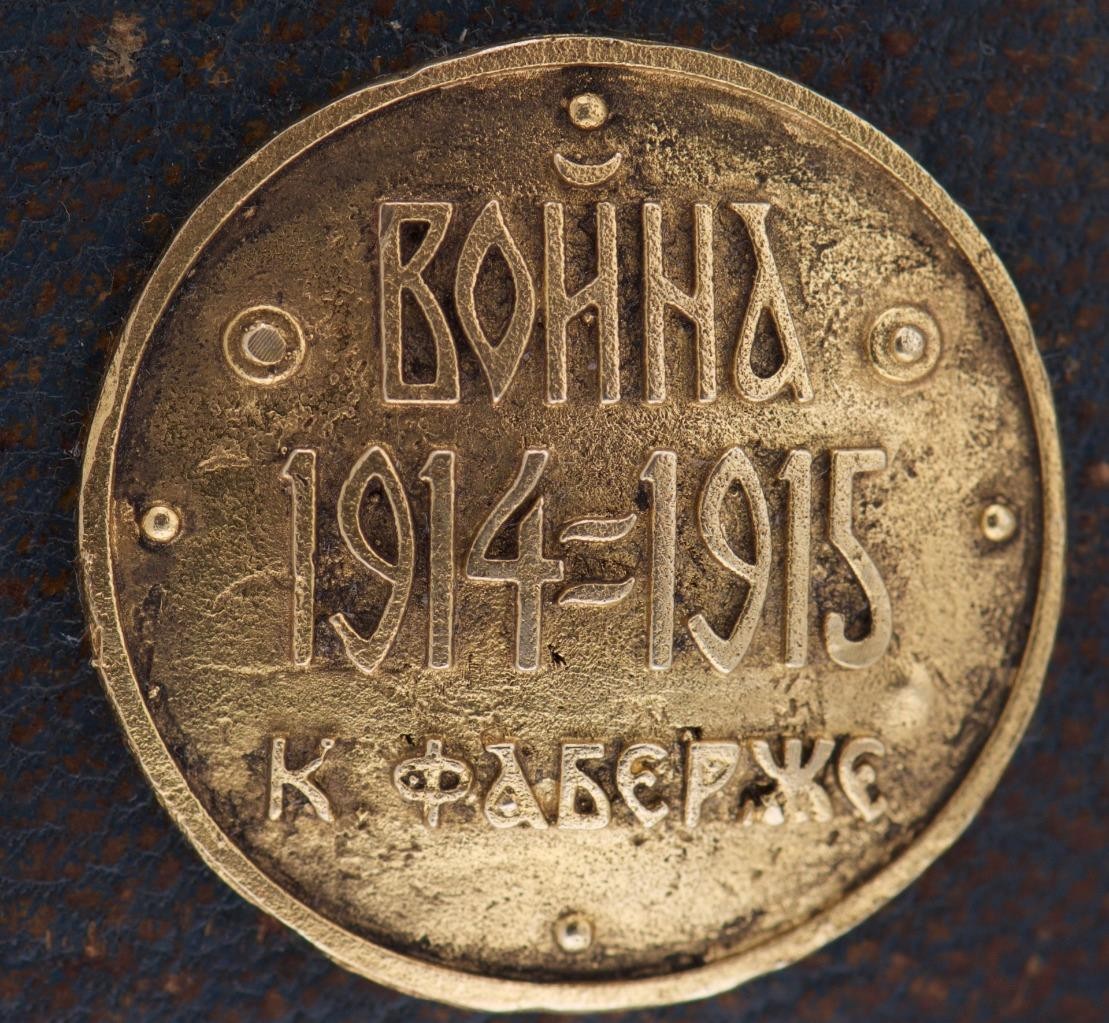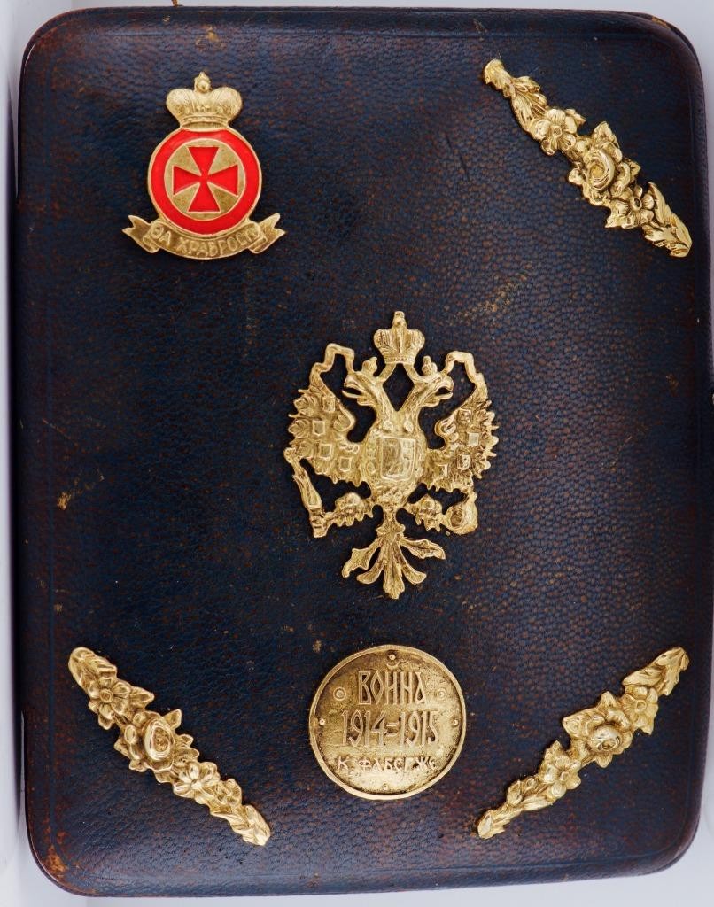 The case is decorated with gold plated ornaments ,Imperial coat of arms-the double headed eagle,with the Saint Anna Bravery Order 4th Class with red enamel and a tag written in Cyrillic “War 1914-1915, K.Faberge”.