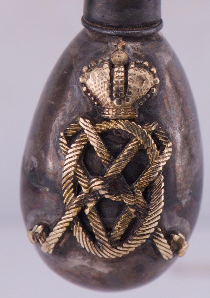 This miniature scent bottle is made of solid silver, richly decorated with a solid gold imperial monogram of the Empress and surmounted by a finely detailed solid gold Romanov crown. The gold rope-tied cipher and regal detailing exemplify Fabergé’s extraordinary craftsmanship during the height of the Imperial era.
