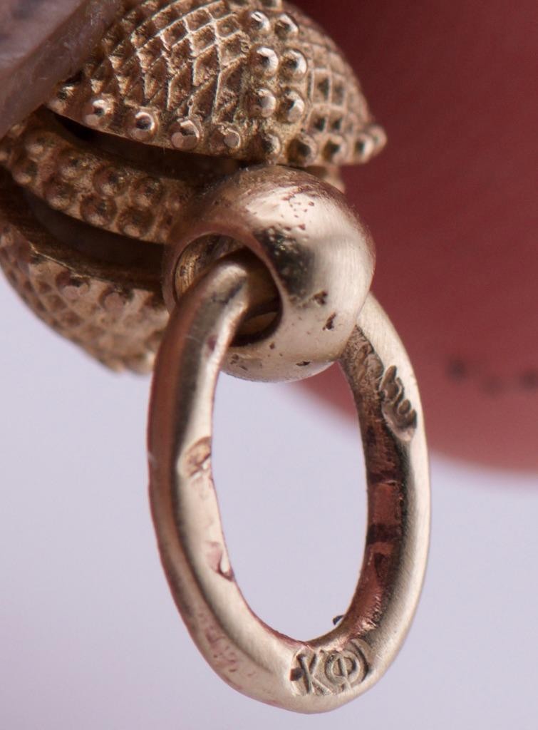 Clearly marked on the gold suspension ring and fittings with Fabergé marks and gold 56  stamps (see close-up photographs).