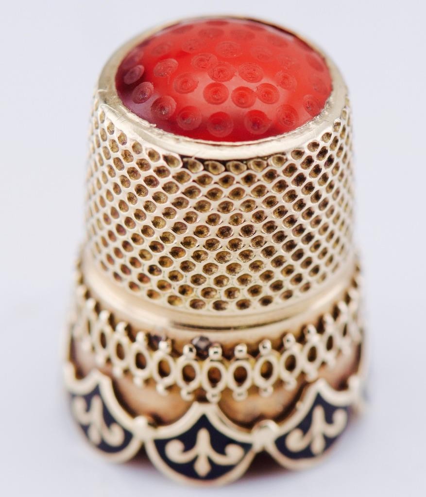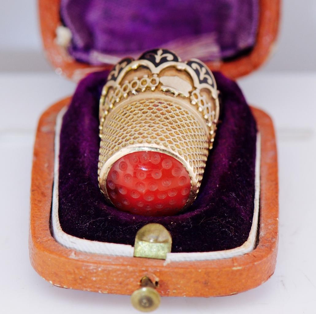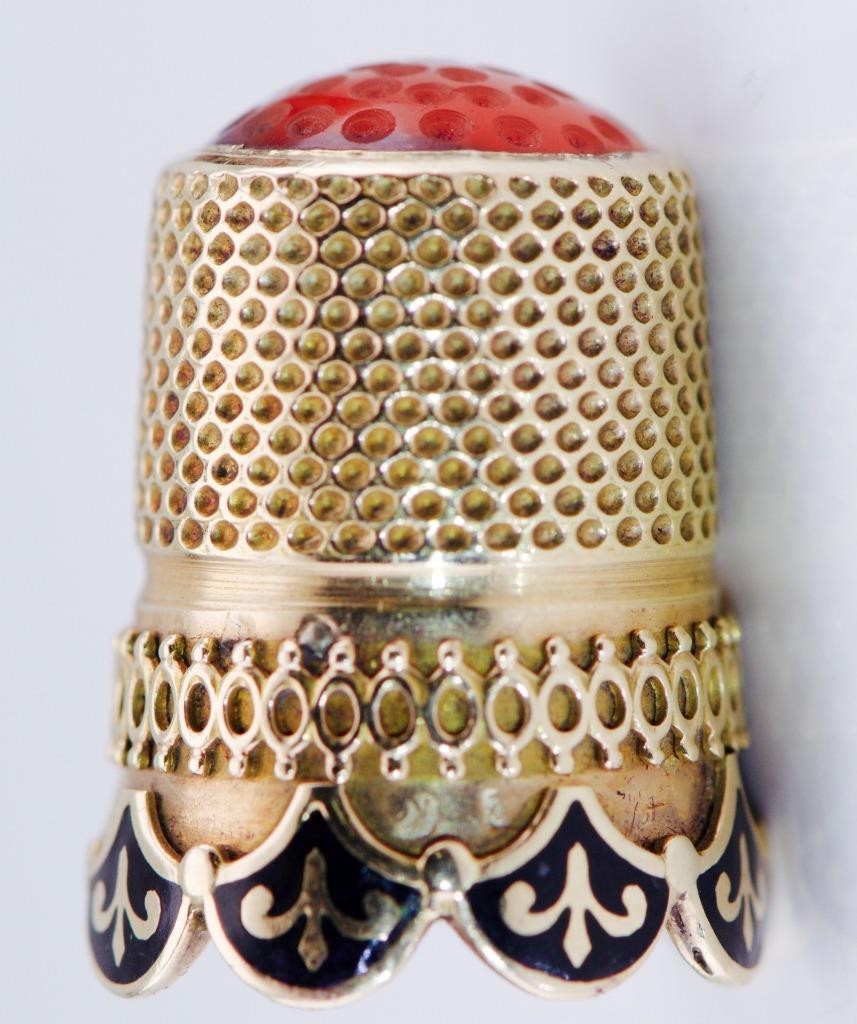 Offered is an extraordinary antique Fabergé thimble, produced circa 1890s, crafted in solid 18k gold, richly decorated with fine enamel work and crowned with a polished carnelian hardstone finial.