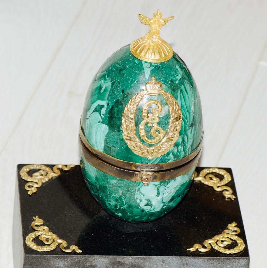 I am pleased to offer from my private collection this extraordinary antique Imperial presentation desk clock, crafted in the form of an Easter egg, is a masterpiece of imperial craftsmanship. Made of hand carved rich malachite semi-precious stone, this rare collectible features the royal monogram of Empress Catherine II the Great (r.1762-1796) and dates back to the 1790s, making it a highly sought-after historical artifact. Features and Details: • Material: Genuine malachite hard stone with exquisite natural green patterns. • Design: • Egg-shaped body, hinged to reveal a mechanical clock on one side and a velvet-lined compartment on the other. • Detailed imperial crest and Catherine II’s monogram in gilt metal, symbolizing its royal provenance. • Decorated marble stone base featuring an Imperial Cross of St. George emblem, highlighting its historical and military significance. • Clock Movement: Intricate and beautifully engraved clockwork mechanism, visible through an interior panel.Key wind -comes with the original key. • Condition: • Overall excellent preservation considering its age. • Some minor wear to the metal and interior consistent with age and use. • Clock mechanism works perfect. •Dial: fine enamel dial depicting a portrait of Empress Catherine II. Historical Significance: This piece is believed to have been commissioned as an imperial gift, intended for presentation to a distinguished recipient in the Royal court. The use of malachite, a stone highly prized in imperial artistry, combined with the emblems of Catherine the Great, makes this clock a remarkable and authentic item of historical importance. Dimensions: • Height: 22cm Why This Piece is Unique: • A true collector’s treasure, rare and likely one of a kind. • Represents the opulence and artistry of 18th-century imperial craftsmanship. • Perfect for collectors of antique clocks, or royal memorabilia. Shipping & Packaging: • Professionally packed for secure worldwide shipping. Don’t miss your chance to own this rare and exceptional piece of imperial history. Ideal for museums, collectors, or as the centerpiece of a private collection. For additional details or high-resolution photos, please feel free to contact me.