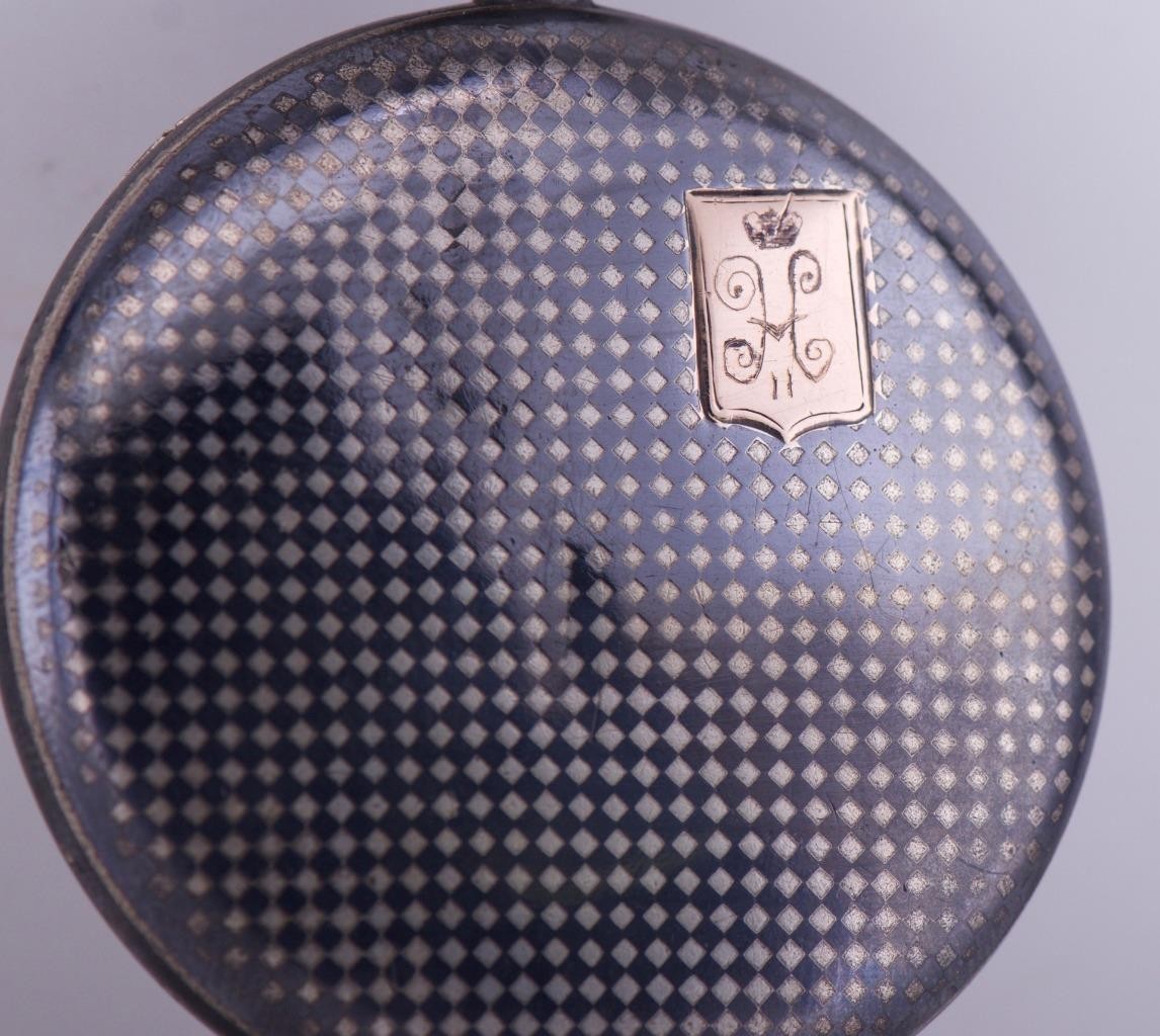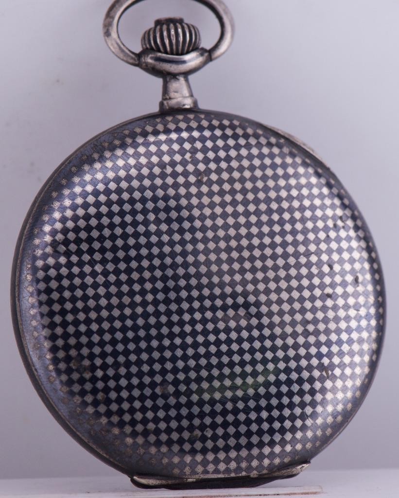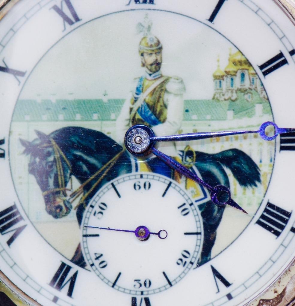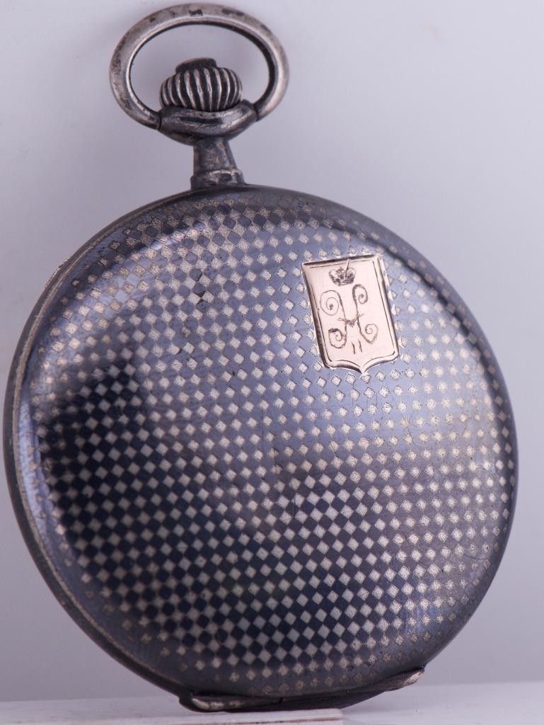 I am pleased to offer from my private collection this rare antique pocket watch which is a unique piece of imperial history. It features a beautifully crafted silver niello case with gold monogram and an enamel dial adorned with a portrait of Tsar Nicholas II on horse. This extraordinary timepiece is a must-have for collectors of imperial artifacts or fine historical watches. Key Features: • Material: Solid silver niello full hunter case made by the most famous case master Huguenin Freres(hallmarked HF) with intricate checkerboard patterns with solid gold shield depicting engraved monogram of Tsar Nicholas II. • Dial Design: An enamel portrait of Tsar Nicholas II on horse prominently displayed on the dial, surrounded by elegant Roman numeral hour markers. • Movement: High-quality mechanical movement with intricate details. The inner workings are visible and appear to be original and intact. • Size: 50mm • Condition: Excellent condition for its age, with minor wear consistent with its historical significance. Historical Significance: This watch is a presentation piece from the imperial Tsar’s era, highlighting the grandeur of the Romanov dynasty. The exquisite niello work and the detailed portrait of the Tsar make this a significant historical artifact. Why This Watch Stands Out: • A piece of imperial heritage featuring the likeness of Tsar Nicholas II • Exceptional craftsmanship with rare niello work and an enamel portrait. • Perfect for collectors of Romanov memorabilia or antique luxury timepieces. Shipping and Handling: • Professionally packed to ensure safe delivery. • Fully insured shipping with tracking provided. • International shipping available Condition Note: This is an antique piece sold as-is. Perfect working order.