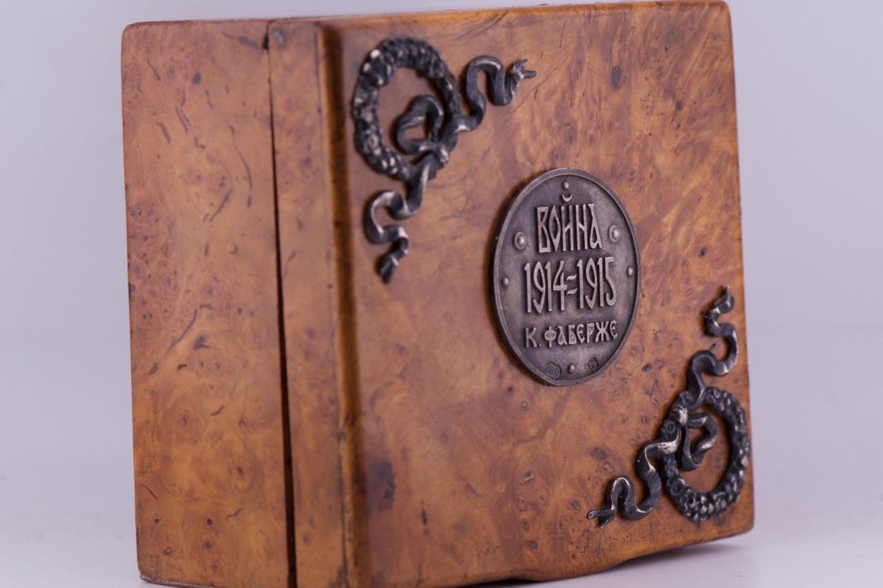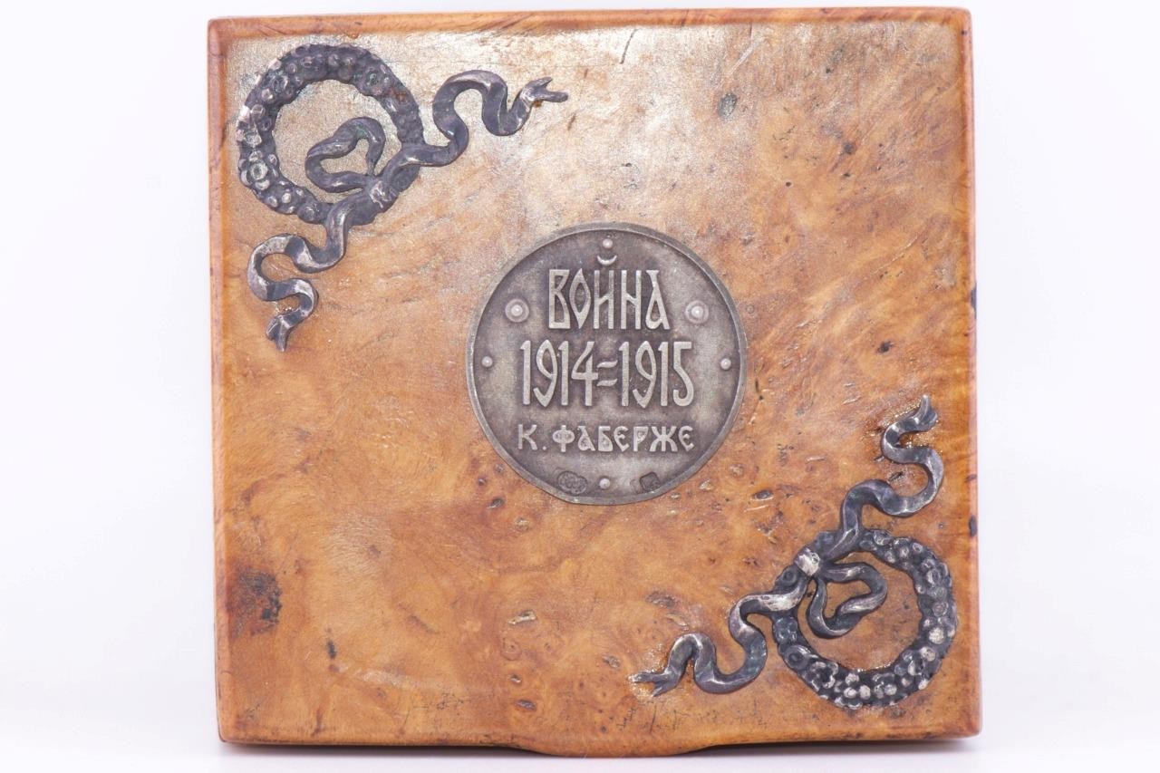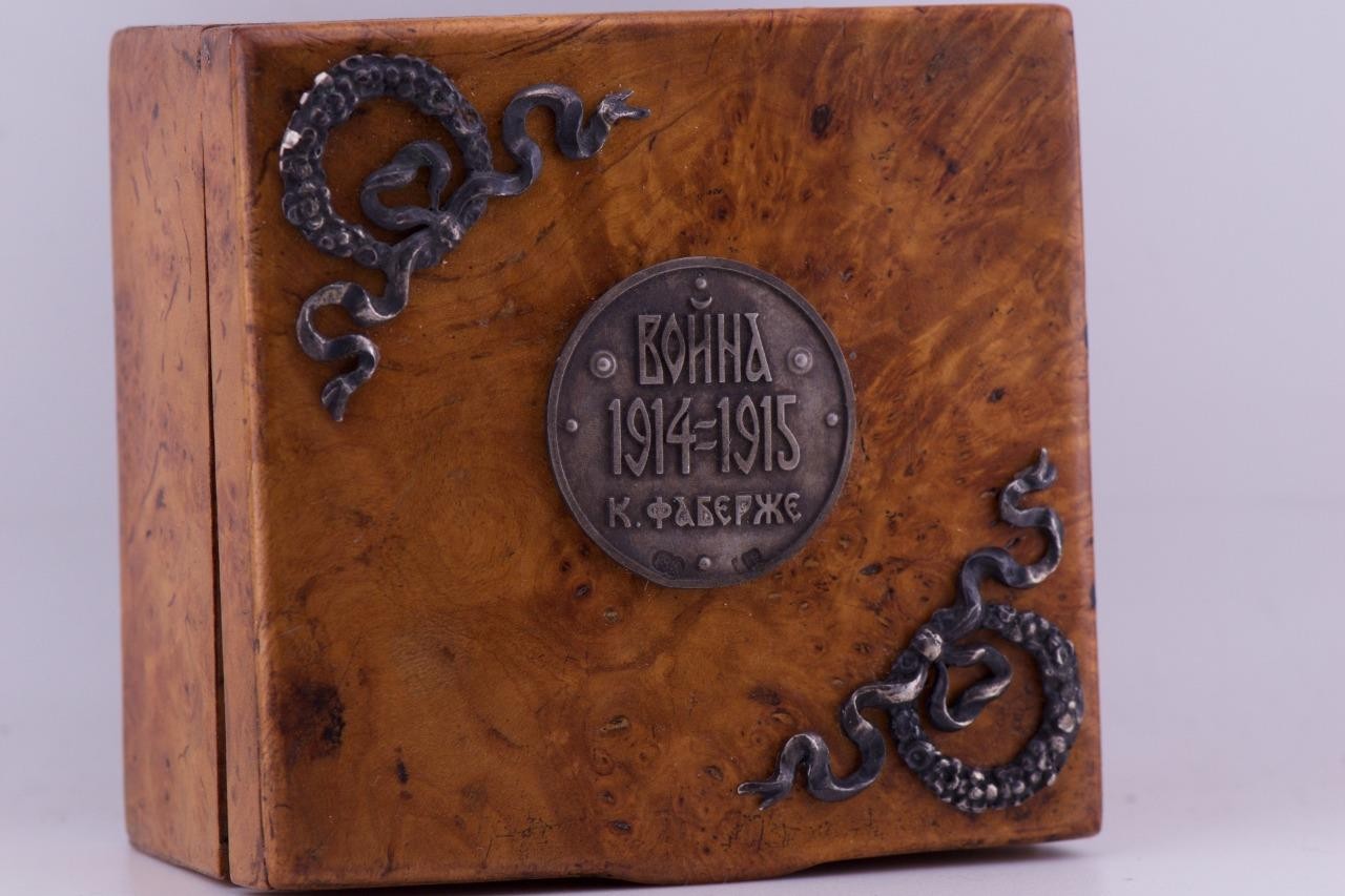 The box is decorated with silver ornaments and a tag written in Cyrillic “War 1914-1915, K.Faberge”.