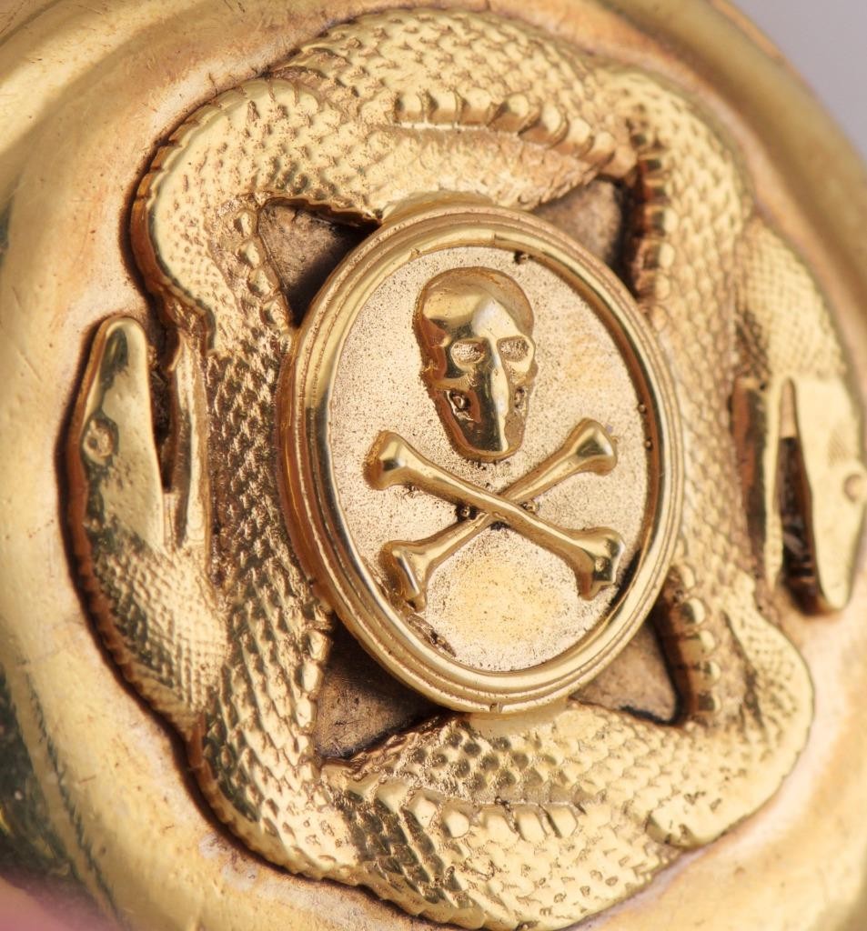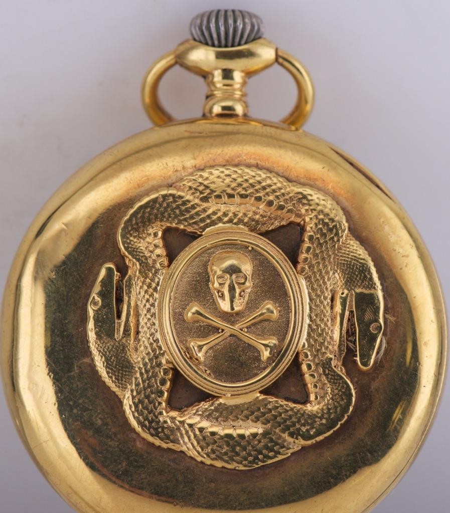 I am pleased to offer from my private collection this exceptional and rare Victorian Memento Mori pocket watch dating to the 1890s, featuring a beautifully enameled dial with a striking scene of Death (skeleton) conversing with a maiden, symbolic of the inevitability of mortality. The dial is adorned with the Latin phrase “Memento Mori”, reminding the wearer to cherish life. The watch is housed in a finely crafted gilt silver chased case with a detailed skull-and-crossbones motif surrounded by an entwined serpent, both powerful symbols associated with mortality and eternity. The case measures 49mm in diameter. The movement is a high-quality keyless wind lever escapement, running in excellent condition and keeping good time. Condition: • Case: Excellent condition with crisp chasing and minimal signs of age. • Dial: Vibrant and intact with no damage to the enamel artwork. • Movement: Clean and in perfect working order. Key Features: • Period: Victorian, circa 1890s • Case: Gilt silver with skull, crossbones, and serpent decoration • Diameter: 49mm • Movement: Keyless lever escapement • Working condition: Yes, runs perfectly This is a museum-worthy collector’s piece, highly desirable for those interested in antique horology, Victorian symbolism, or Memento Mori artifacts. Shipping Worldwide – Will Be Packaged Securely Buy with Confidence – 100% Authenticity Guaranteed
