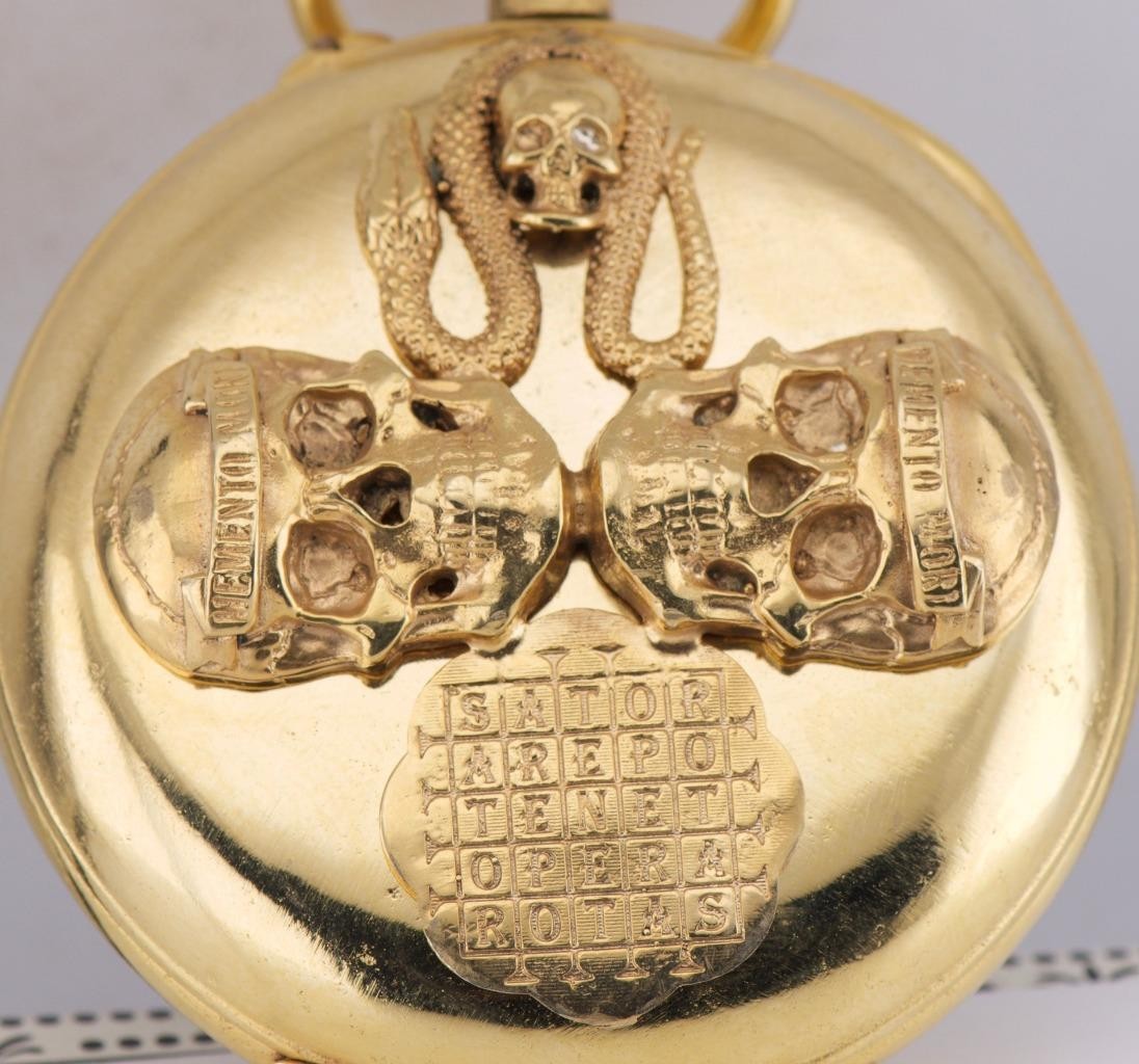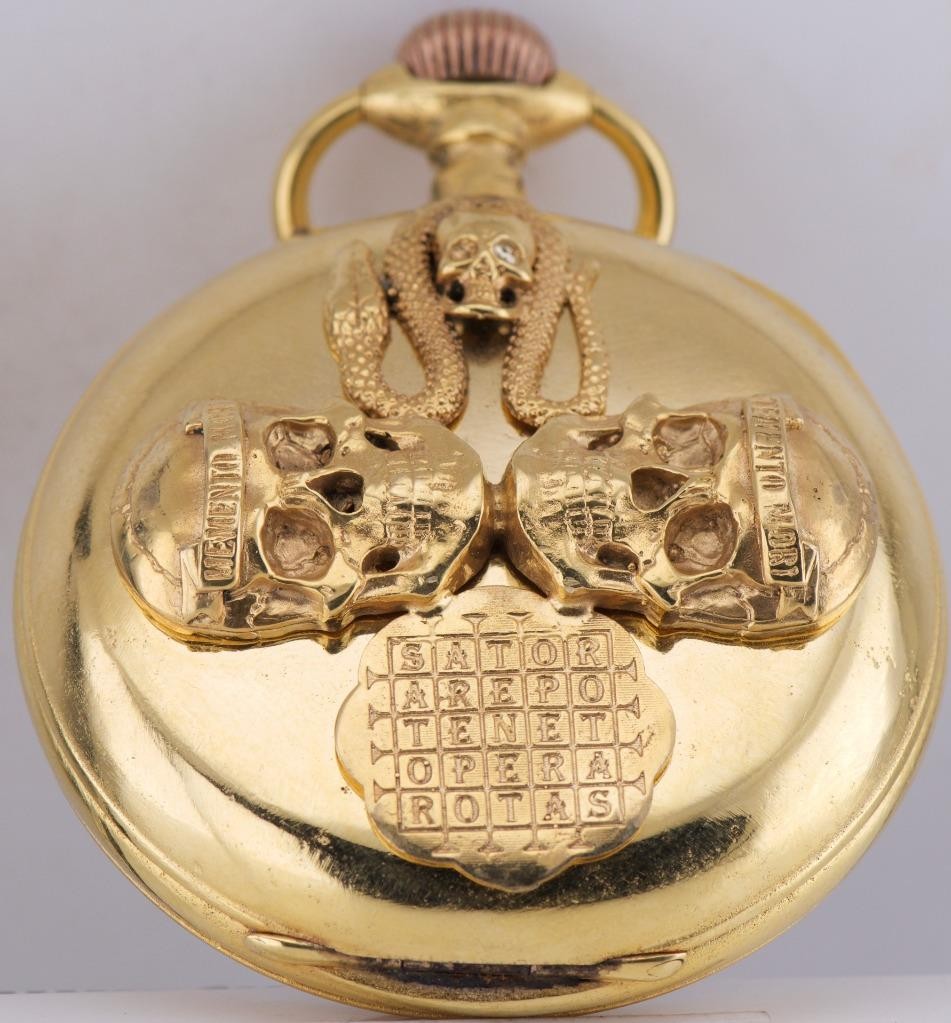 Oversize “Regulator” pocket watches are highly sought after by collectors for their scale and legibility. However, finding one customized with such intense Occult and Memento Mori imagery is exceptionally rare. This is a centerpiece item for a horological collection or a unique find for a practitioner of the esoteric arts. The watch comes with an APPRAISAL CERTIFICATE FOR $2500