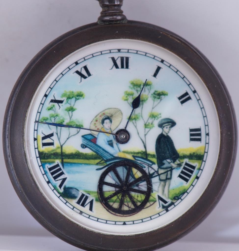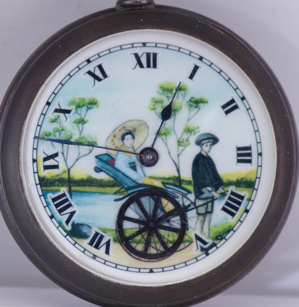 I am pleased to offer from my private collection this rare and exquisite antique Mardon pocket watch, designed for the Chinese market in the early 1930s. This piece showcases incredible craftsmanship and a unique automaton feature. Key Features: • Brand: Mardon • Dial: • Beautifully enamel dial featuring a Chinese rickshaw scene. • The rickshaw’s wheel turns continuously when the watch is wound, demonstrating the automaton function. • Movement: • High-quality mechanical movement, visible upon opening the case back. • Professionally serviced and functioning as intended. • Case:Gunmetal 49mm • Original crown and bow. • Provenance: • Made for the Chinese market, a rare example of horological artistry tailored for specific regional demand. This pocket watch is not only a testament to Mardon’ horological excellence but also a piece of history with its culturally significant automaton dial. A must-have for collectors of rare antique watches or fans of Chinese-themed artistry. Condition: • Dial: Excellent condition with vibrant enamel details. • Case: Minor wear consistent with age. • Movement: Recently serviced and running well. Shipping and Handling: • Professionally packaged for safe delivery. • Ships worldwide with tracking and insurance. Notes: This is a genuine antique timepiece. As such, it may show minor signs of age. Please review all photos for details, and feel free to reach out with questions.