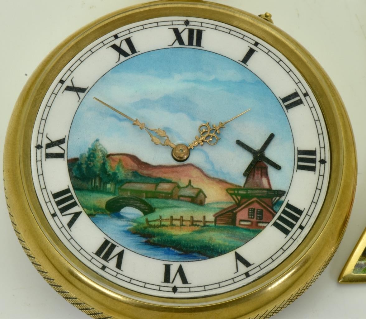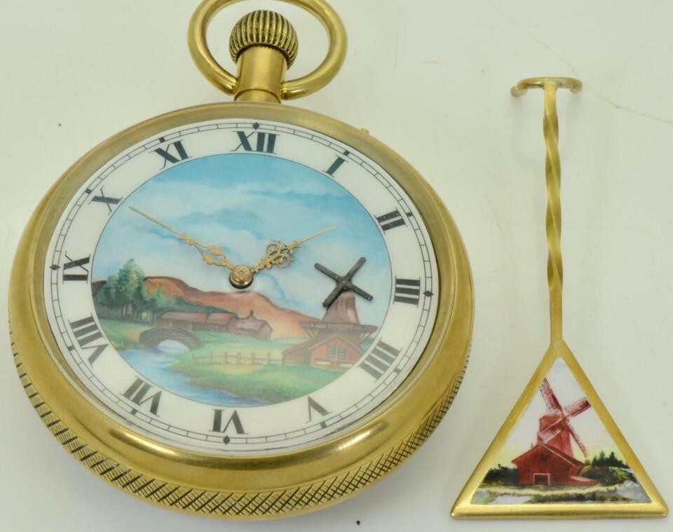 Fancy enamel dial depicting a Dutch Mill which propeller rotates continously when the watch is winded. Fully jeweled anchor chronometer movement with central Chaton,excentric precision regulator with long pointer,ruby endstone on balance,anchor escapement,Breguet spiral,compensating bymetal balance.