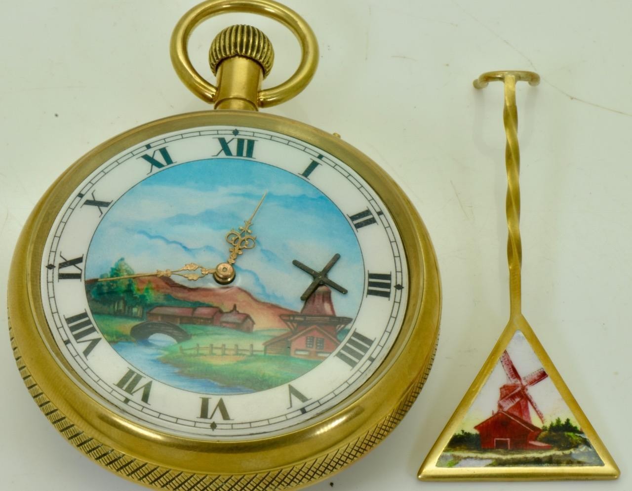 I am pleased to offer from my private collection this very rare antique Swiss made Automaton Dutch Mill enamel dial oversize pocket watch c1890&matching enamelled stand c1890’s. The watch comes with the original stand which allow the watch to stand on a desk. Demonstrator back. You can enjoy the high grade movement.