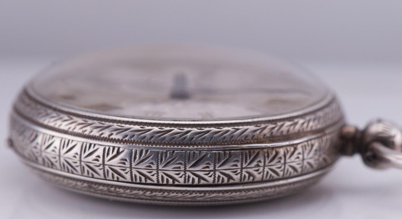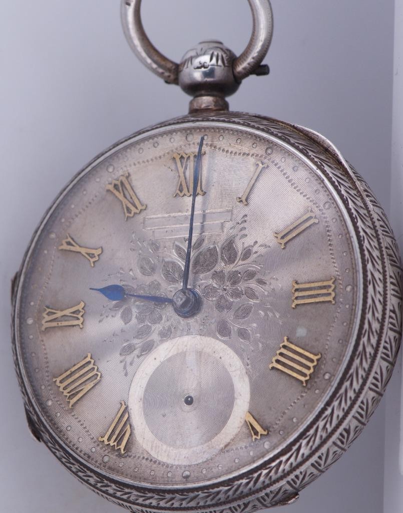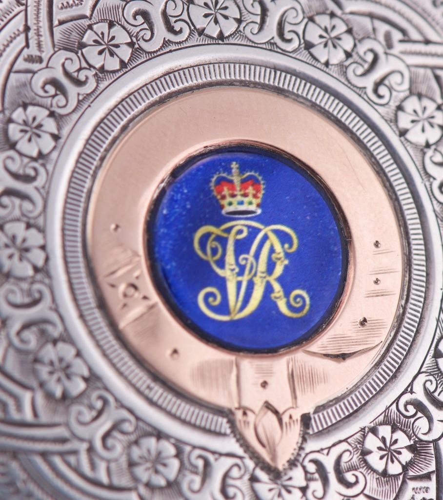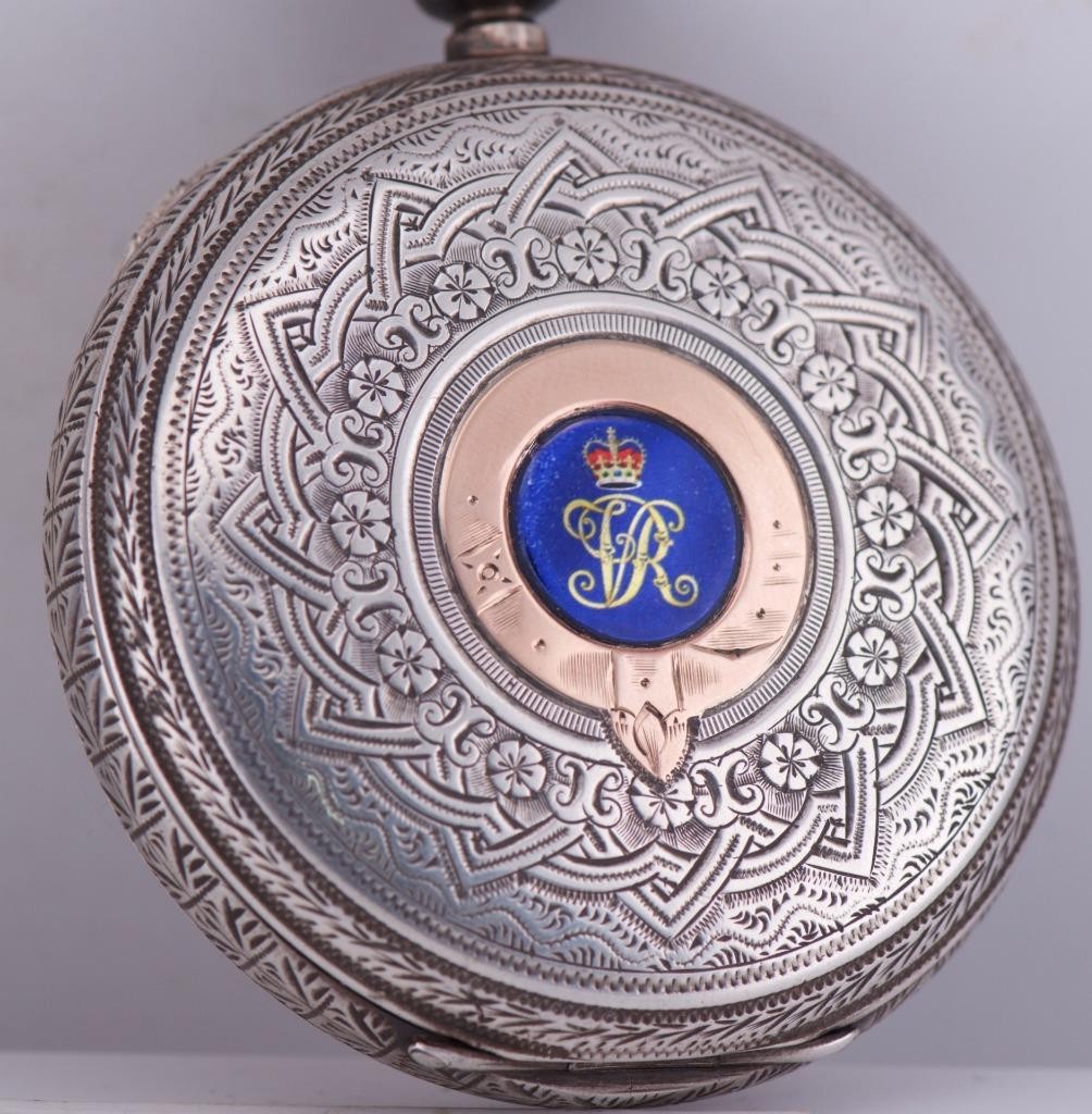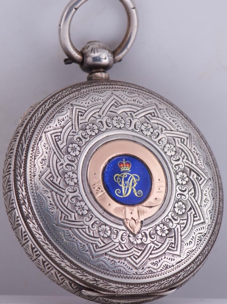 The watch has an amazing entirely hand engraved solid sterling silver case,decorated with gold and enamel center depicting the personal Royal Cypher Monogram of Queen Victoria- VR (Victoria Regina) beneath the crown.