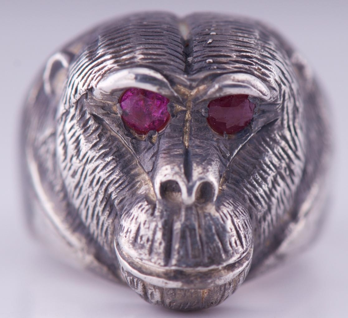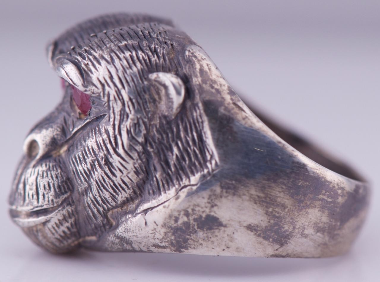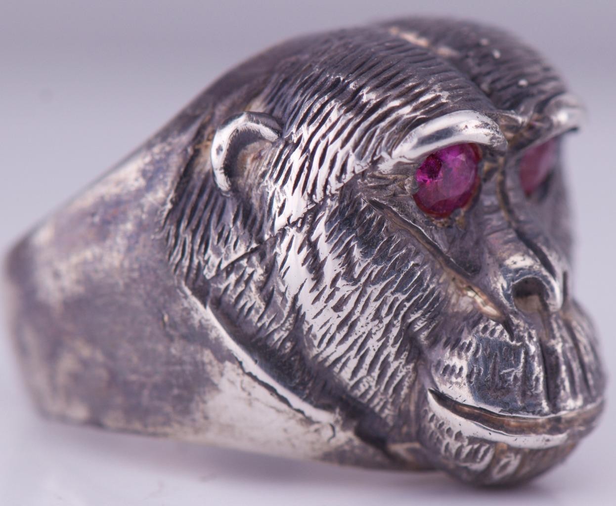 I am pleased to offer from my private collection this rare Antique Silver Monkey Head Large Mens Ring Hand Engraved-Ruby in the Eyes Size 10