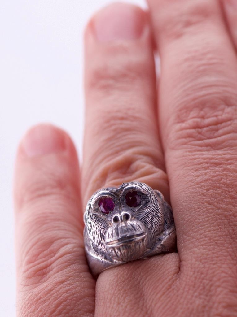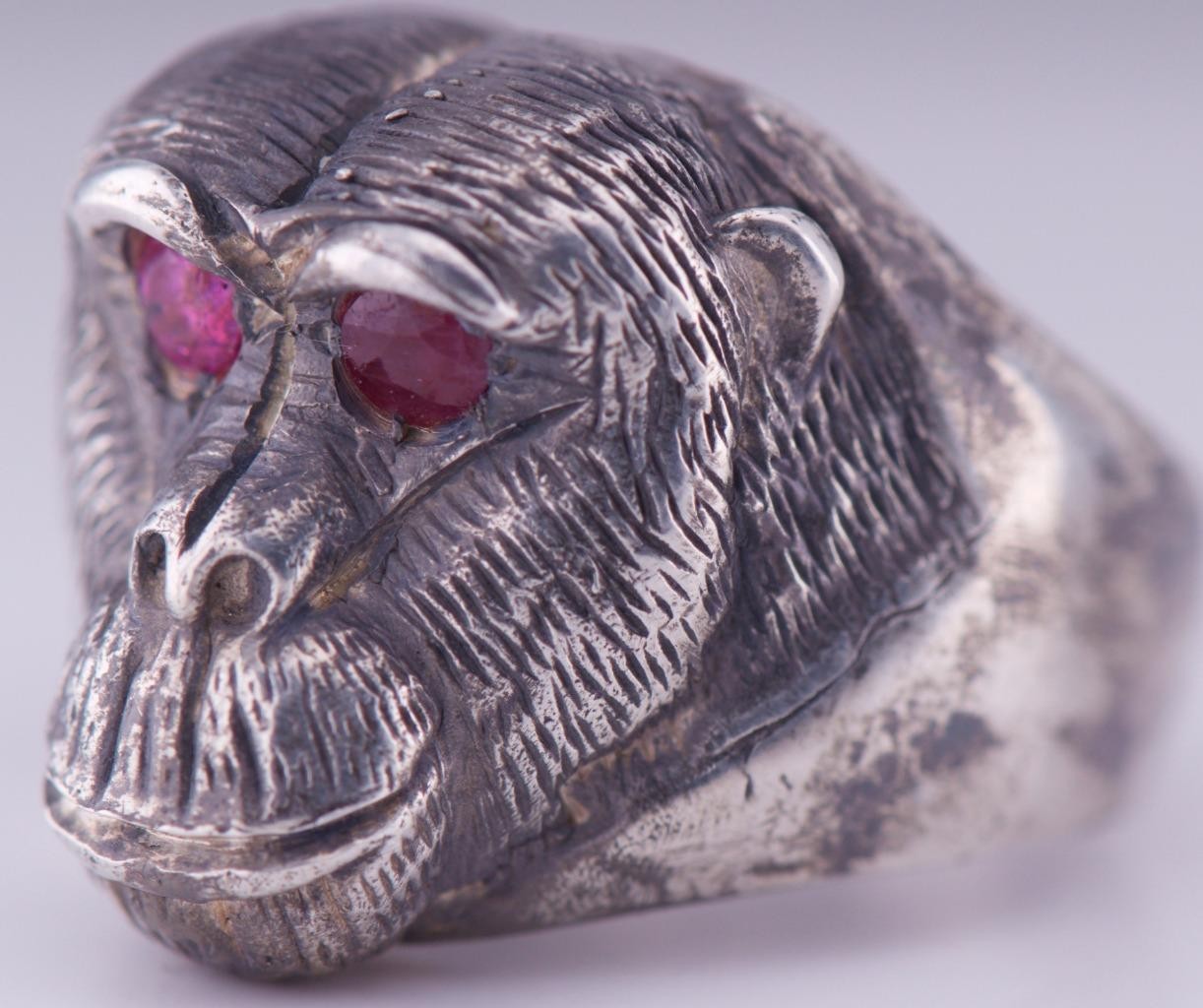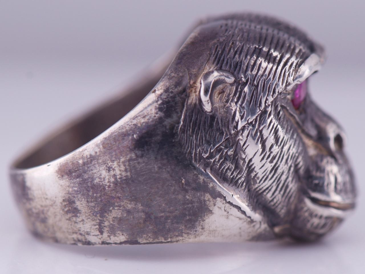 I am pleased to offer from my private collection this rare Antique Silver Monkey Head Large Mens Ring Hand Engraved-Ruby in the Eyes Size 10