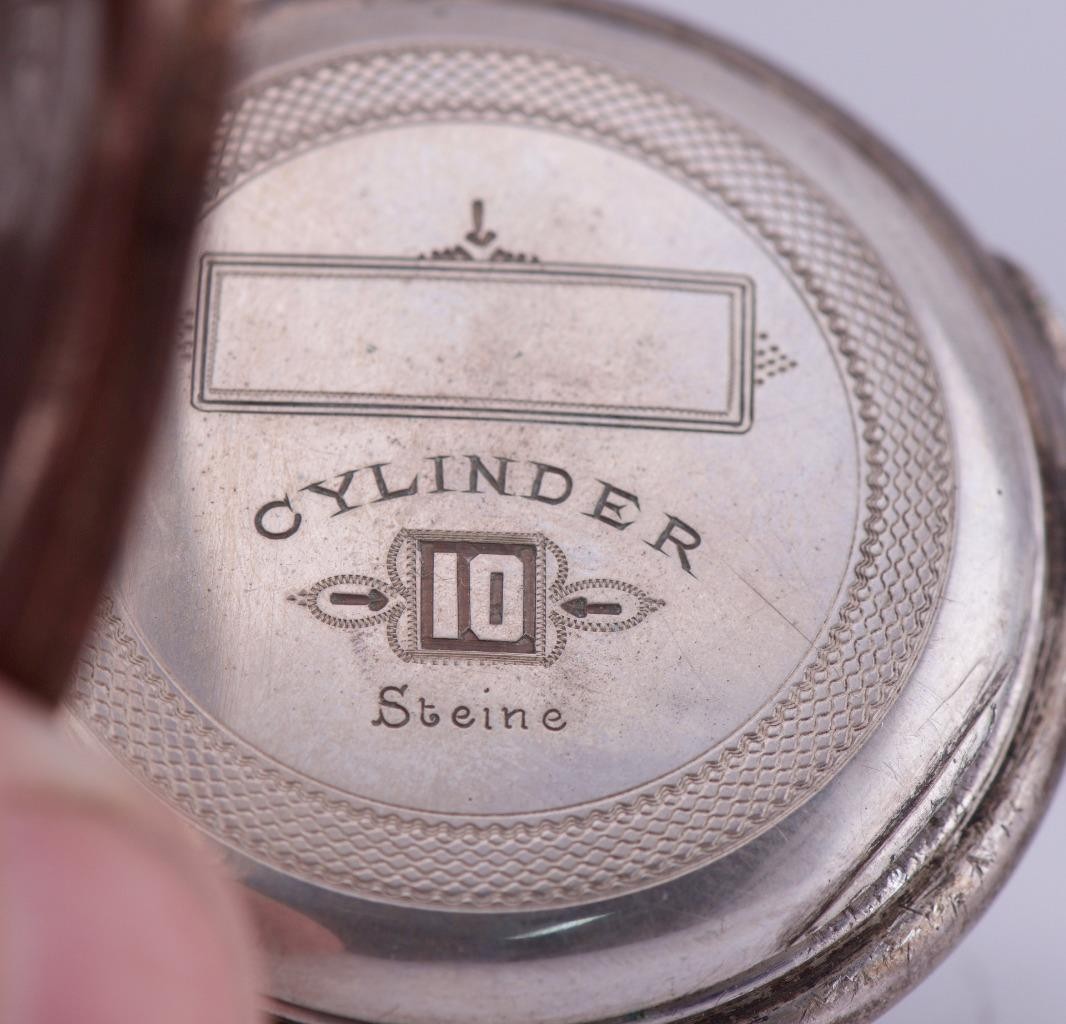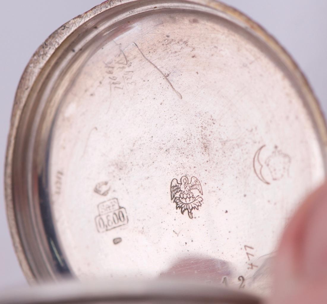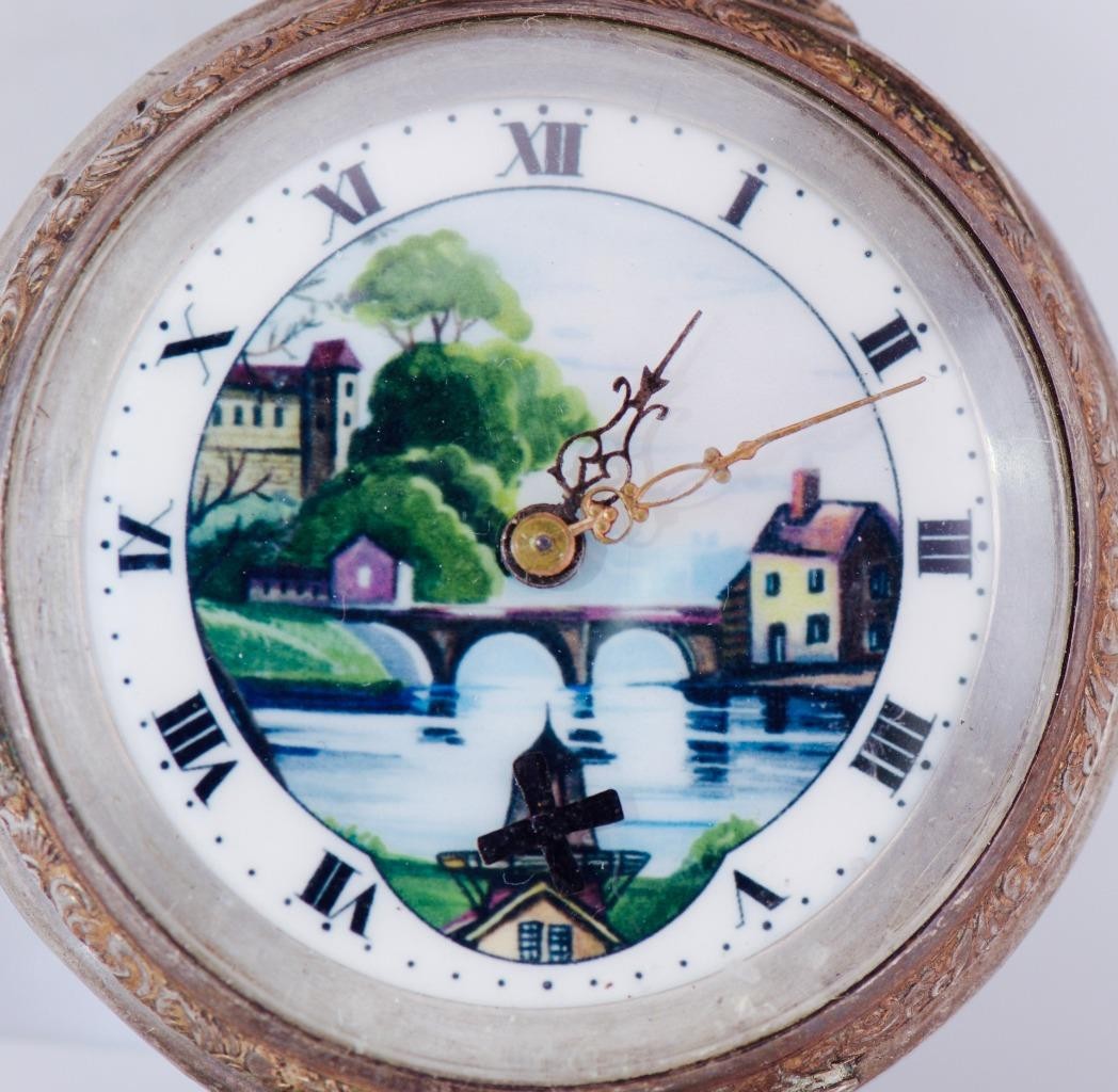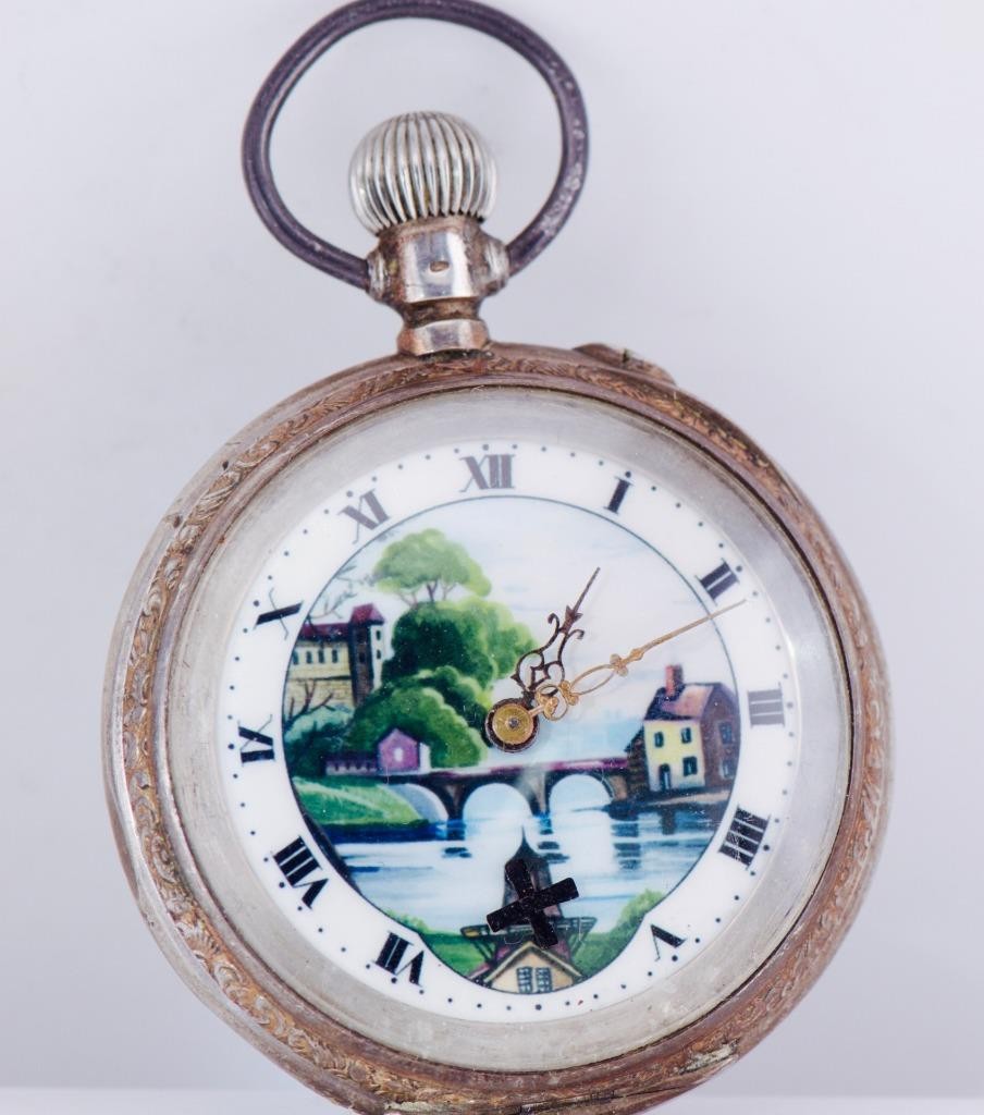 I am pleased to offer from my private collection this Antique Swiss Silver Automaton Pocket Watch – 10 Jewels, Windmill Scene A charming late 19th century Swiss automaton pocket watch, housed in a finely engraved solid silver case. The front features a stunning hand-painted enamel dial depicting a serene countryside scene with a bridge, river, trees, and quaint houses. At the 6 o’clock position, an automaton windmill with rotating sails adds delightful mechanical animation, driven by the movement itself. • Dial: Roman numeral chapter ring surrounding a vivid hand-painted rural scene. The automaton windmill is fully functional and visually engaging. • Movement: Swiss-made cylinder escapement with 10 jewels (“10 Steine” marked on the cuvette). The movement is stamped with the Swiss eagle hallmark. • Case: Stamped “0.800” for continental silver purity, with Swiss control marks. The outer case is richly decorated with foliate engraving and a blank cartouche. • Size: Standard gentleman’s pocket watch dimensions, ideal for display or collection. • Condition: Presents with signs of age and use. Enamel dial remains vibrant. Automaton function operates correctly. Case retains sharp detail with some surface wear consistent with age. A beautiful example of automaton horology, blending artistry with mechanical ingenuity. Ideal for collectors of animated pocket watches or Swiss silver timepieces.