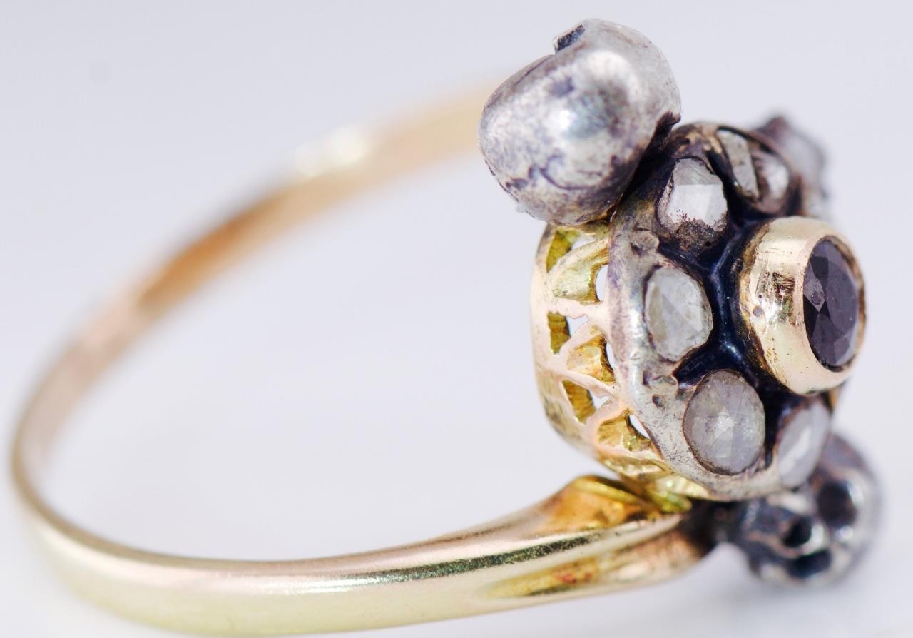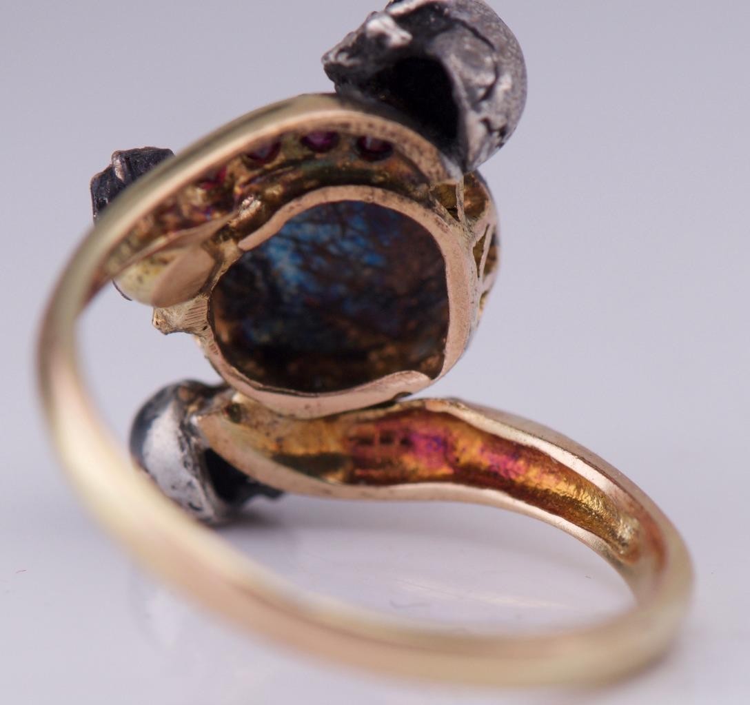 I am pleased to offer from my private collection this  rare and evocative Victorian memento mori ring, exquisitely crafted in 18k yellow gold with a silver setting. This extraordinary piece features two finely detailed skulls symbolizing mortality, framed with old-cut diamonds and a row of natural rubies. At the center sits a deep blue sapphire, creating a dramatic contrast with the antique silver patina. This ring exemplifies the 19th-century fascination with memento mori jewelry, serving as both a piece of wearable art and a reminder of life’s impermanence. Details: • Era: Victorian (circa 19th century) • Design: Twin Skull Memento Mori with gemstone accents • Materials: 18K Yellow Gold (tested) & Silver • Gemstones: • Center: Natural Sapphire • Surround: Old Rose Cut Diamonds • Accents: Natural Rubies • Total Weight: 5.3 grams • Ring Size: US 8.75 (can be resized by a skilled jeweler) Condition: Excellent antique condition with original patina and secure settings. Minimal age-related wear, enhancing its authenticity and character. It comes with an APPRAISAL CERTIFICATE FOR $2500 Provenance: Private European collection. Shipping & Returns • Ships worldwide with full insurance and tracking • Professionally packaged for safe delivery • Returns accepted within 60 days  A museum-worthy example of Victorian memento mori jewelry, featuring detailed skull motifs and fine gemstones. A rare opportunity for collectors and antique jewelry enthusiasts.