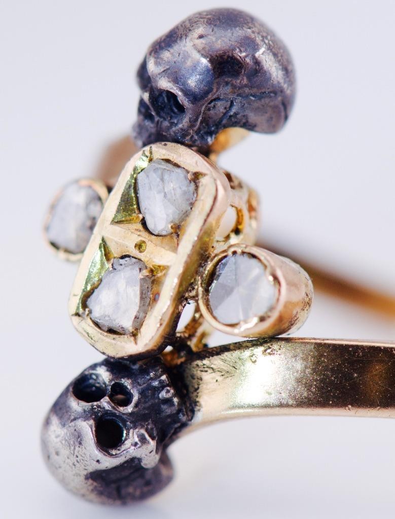 I am pleased to offer from my private collection this  rare and evocative Victorian memento mori ring, exquisitely crafted in 18k yellow gold with a silver setting. This extraordinary piece features two finely detailed skulls symbolizing mortality, framed with old-cut diamonds . This ring exemplifies the 19th-century fascination with memento mori jewelry, serving as both a piece of wearable art and a reminder of life’s impermanence. Details: • Era: Victorian (circa 19th century) • Design: Twin Skull Memento Mori with gemstone accents • Materials: 18K Yellow Gold (tested) & Silver • Gemstones: • Surround: Old Rose Cut Diamonds • Total Weight: 4 grams • Ring Size: US 6.5 (can be resized by a skilled jeweler) Condition: Excellent antique condition with original patina and secure settings. Minimal age-related wear, enhancing its authenticity and character. It comes with an APPRAISAL CERTIFICATE FOR $2500 Provenance: Private European collection. Shipping & Returns • Ships worldwide with full insurance and tracking • Professionally packaged for safe delivery • Returns accepted within 60 days  A museum-worthy example of Victorian memento mori jewelry, featuring detailed skull motifs and fine gemstones. A rare opportunity for collectors and antique jewelry enthusiasts.