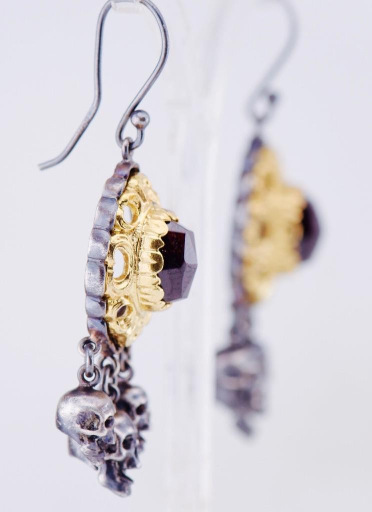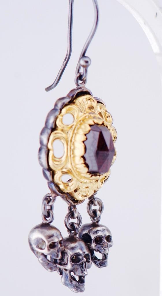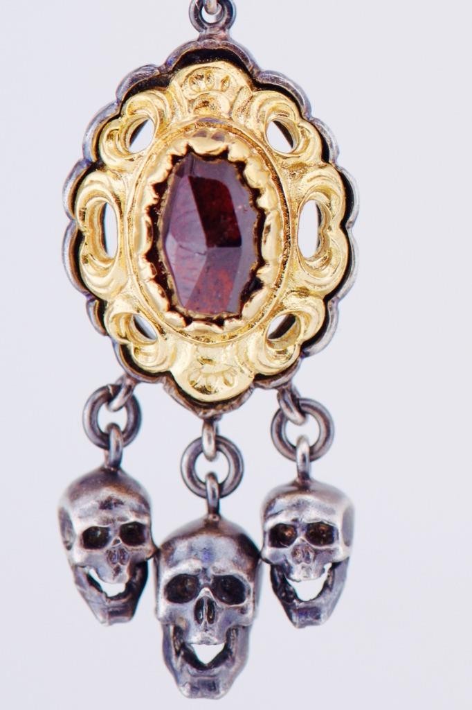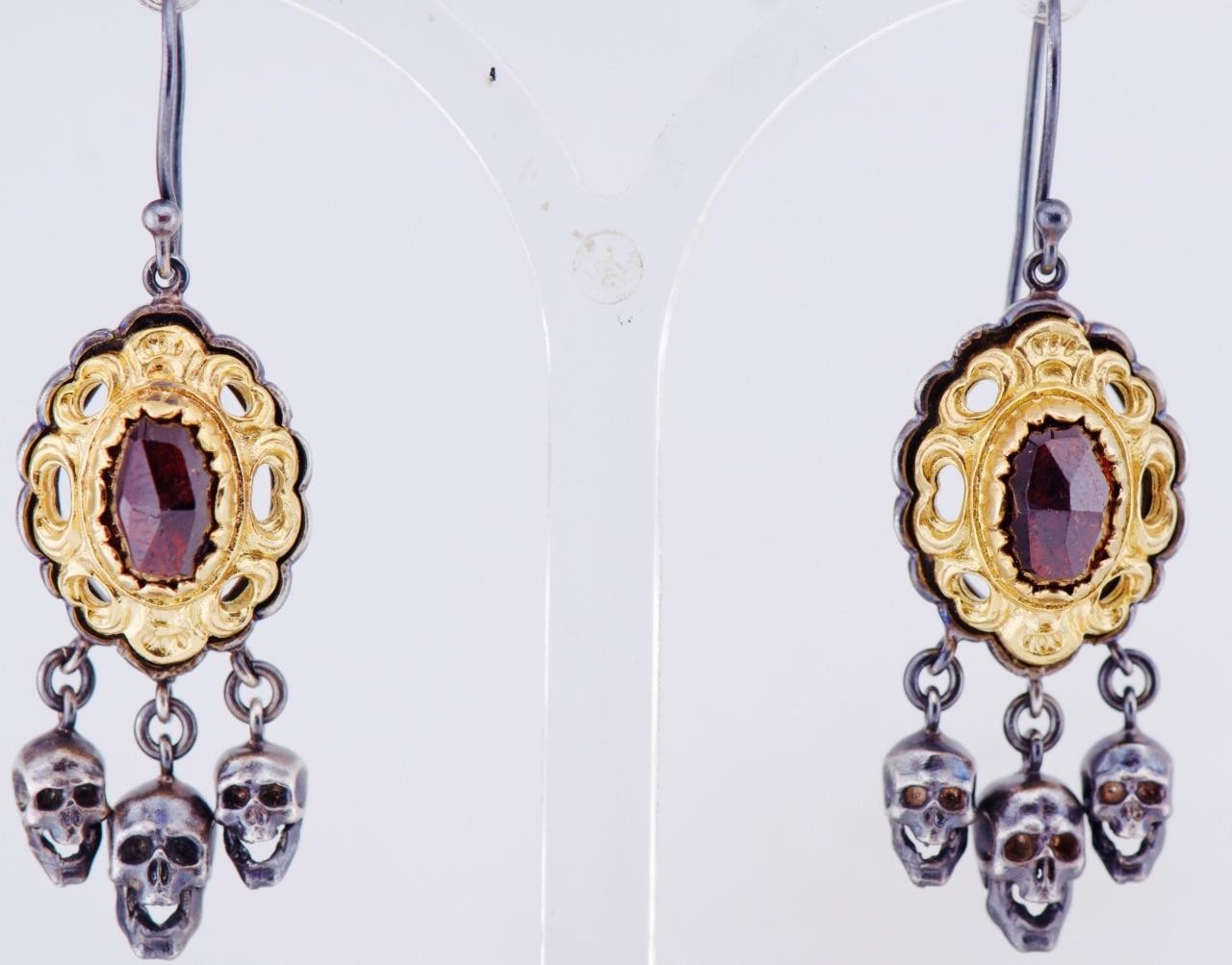 I am pleased to offer from my private collection these stunning antique Victorian memento mori earrings date back to circa 1890. Featuring a unique and rare design, these earrings are crafted from silver and gold-plated, adding elegance and authenticity to their historical charm. The focal point of these earrings is the intricate memento mori motif, adorned with three dangling silver skulls that embody the Victorian fascination with mortality and symbolism. Above the skulls, each earring showcases a beautifully set natural garnet in a decorative gold-plated frame. The garnets add a rich, deep red sparkle, making these earrings a true statement piece. Key Features: • Era: Victorian, c.1890 • Material: Silver with gold plating • Stones: Natural garnets • Design: Memento mori skulls with intricate decorative details • Condition: Excellent antique condition with minor age-related wear Dimensions: • Drop length: 54mm These earrings are not only a piece of jewelry but a wearable piece of history, perfect for collectors or those who love unique antique accessories. Shipping: Securely packaged and shipped with tracking. International shipping available. Don’t miss this rare opportunity to own a remarkable pair of Victorian memento mori earrings. Add them to your collection or gift them to someone who appreciates antique treasures. Feel free to ask any questions or request additional photos before bidding!