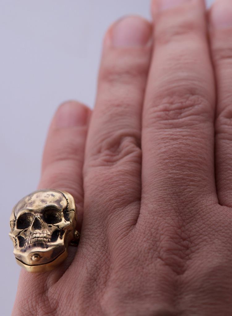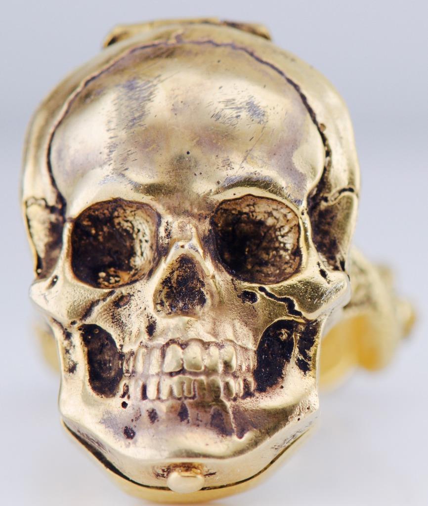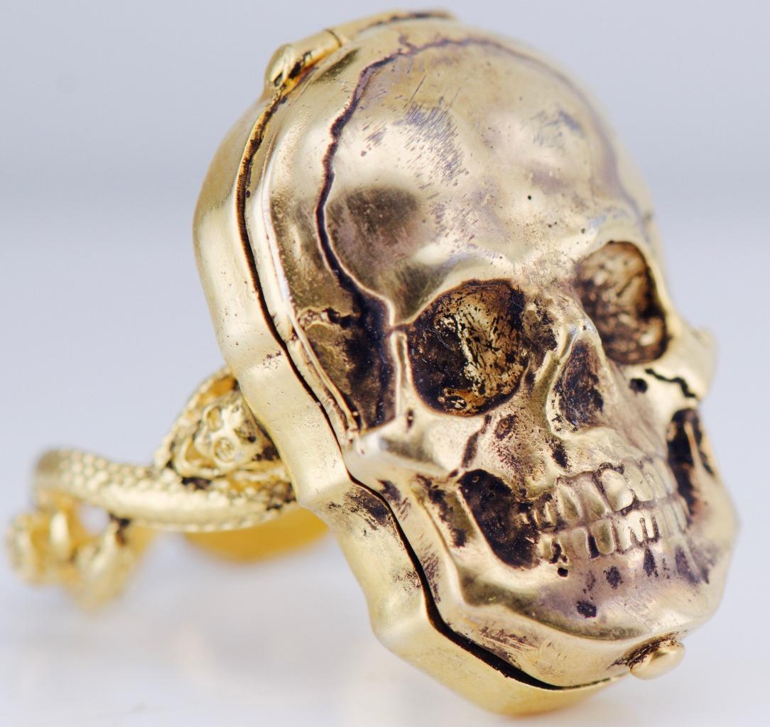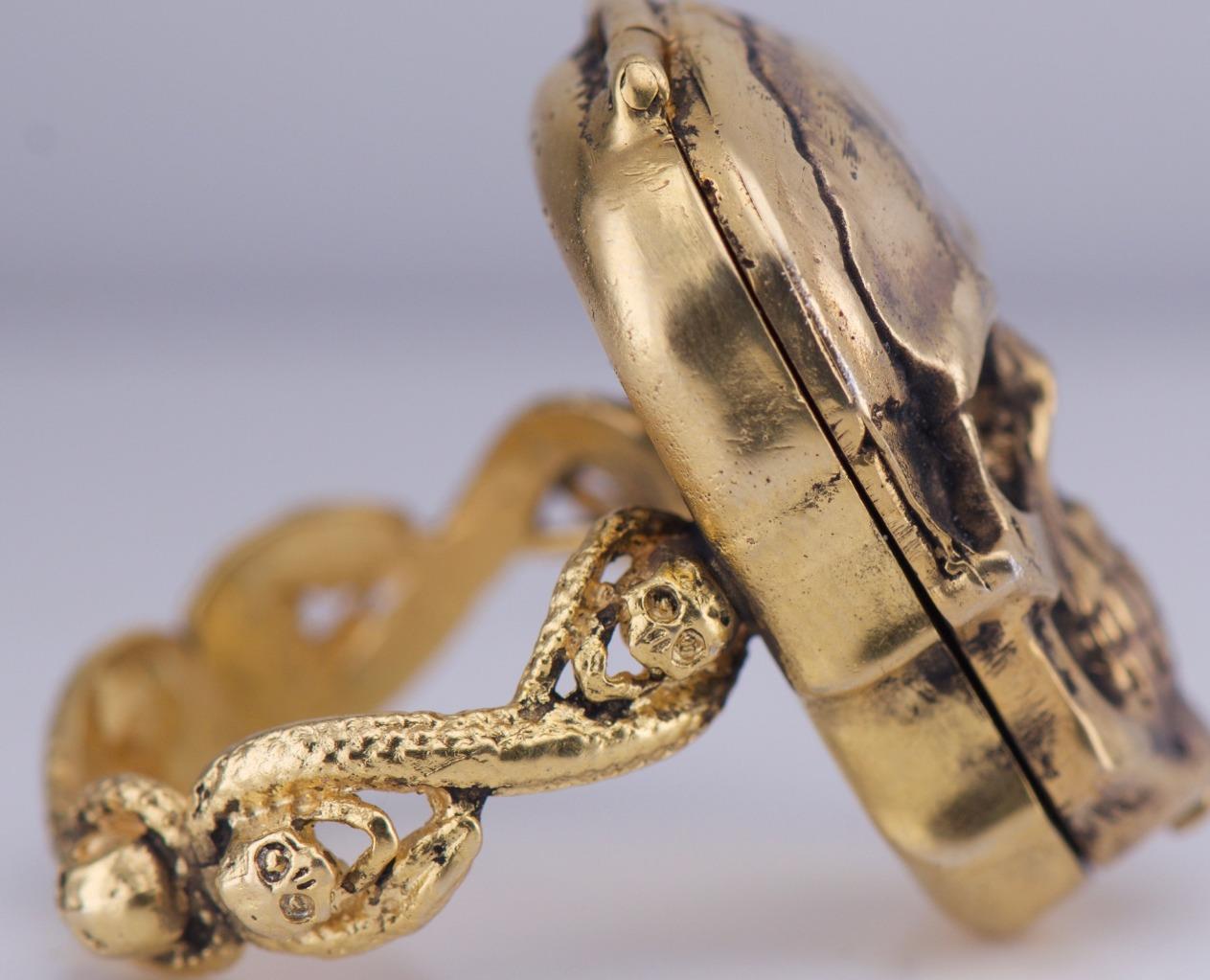 A rare and exceptional Victorian memento mori skull ring, crafted in 18K gilt over sterling silver, featuring an intricately detailed human skull locket that opens to reveal a hidden compartment. Often called a poison ring or mourning locket ring, pieces of this complexity were symbols of mortality, remembrance, and status during the 19th century.