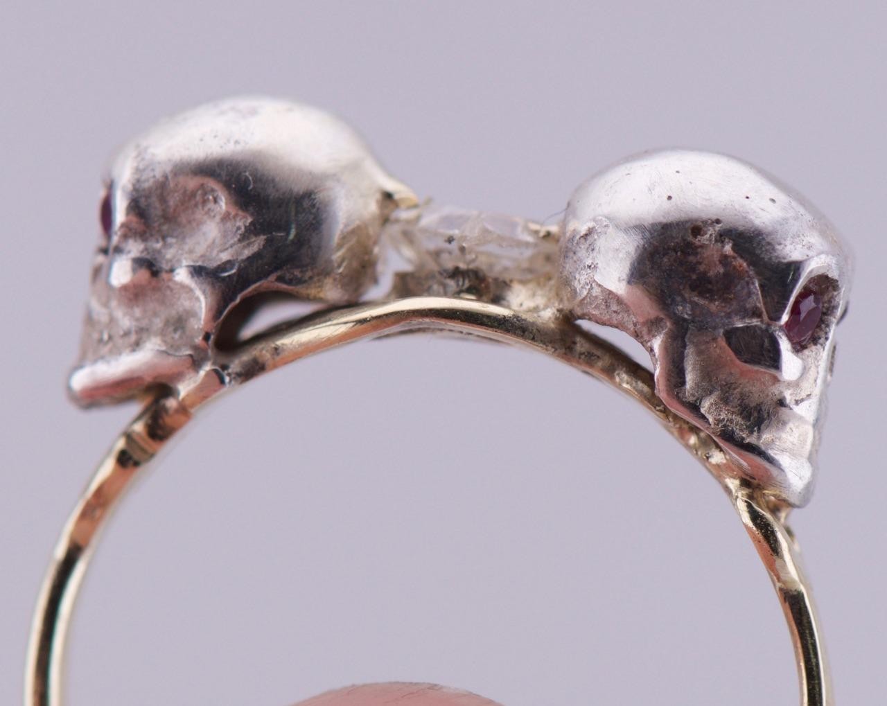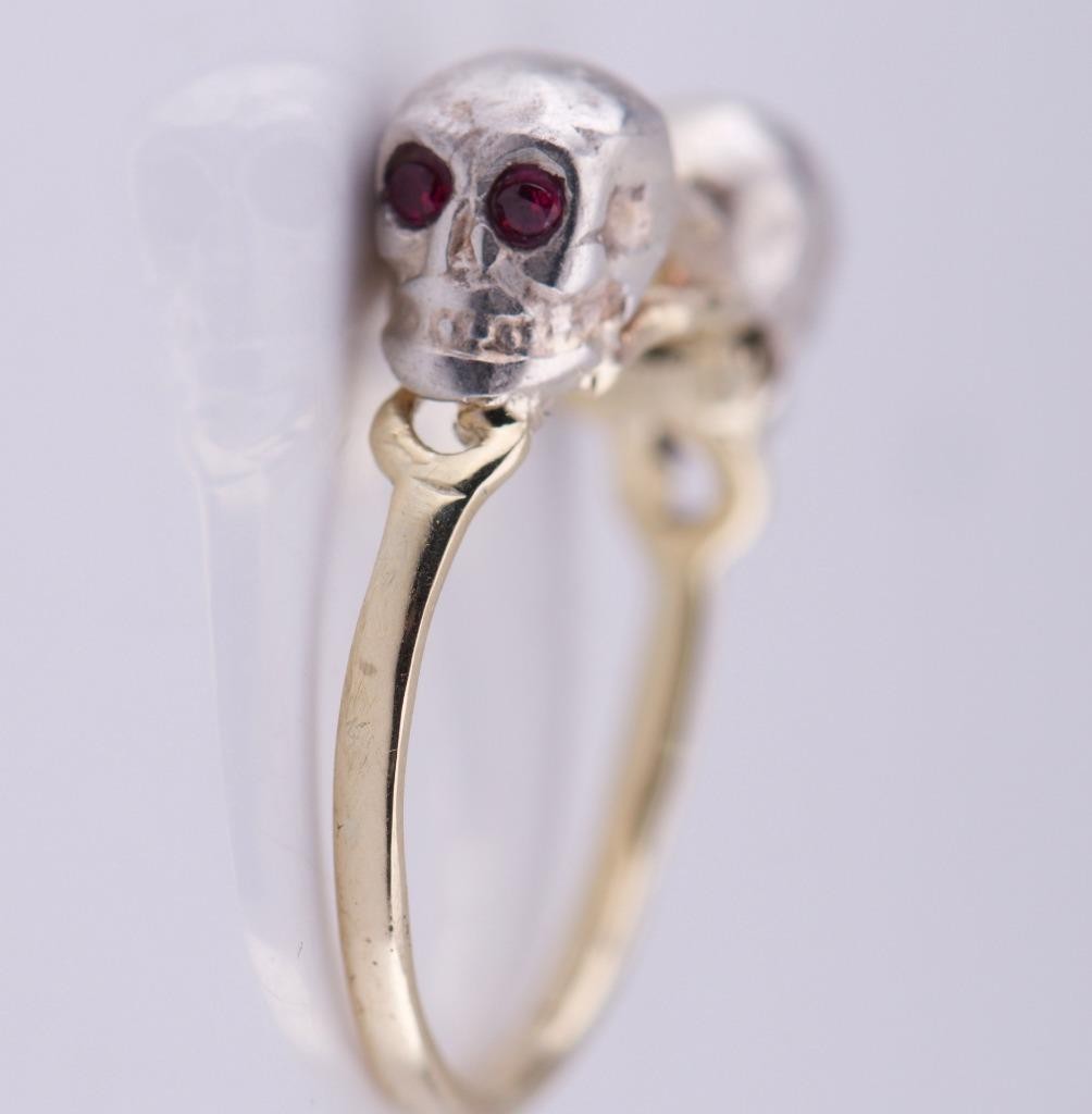A striking and symbolic antique Victorian ring – a rare example of fine mourning jewelry—fusing Gothic beauty with high craftsmanship. Made in silver-topped 14K yellow gold, it features a raised rectangular diamond. On each shoulder sits a finely modeled silver skulls with ruby eyes, reinforcing the memento mori symbolism—a powerful reminder of life’s impermanence.  • Condition: Excellent antique condition  • Size :8 • Weight: 4 grams An exceptional piece for collectors of antique Gothic jewelry, mourning art, or lovers of deeply symbolic historical adornments. It comes with an APPRAISAL CERTIFICATE FOR $2000 Buy It Now – Add this unique antique treasure to your collection today!