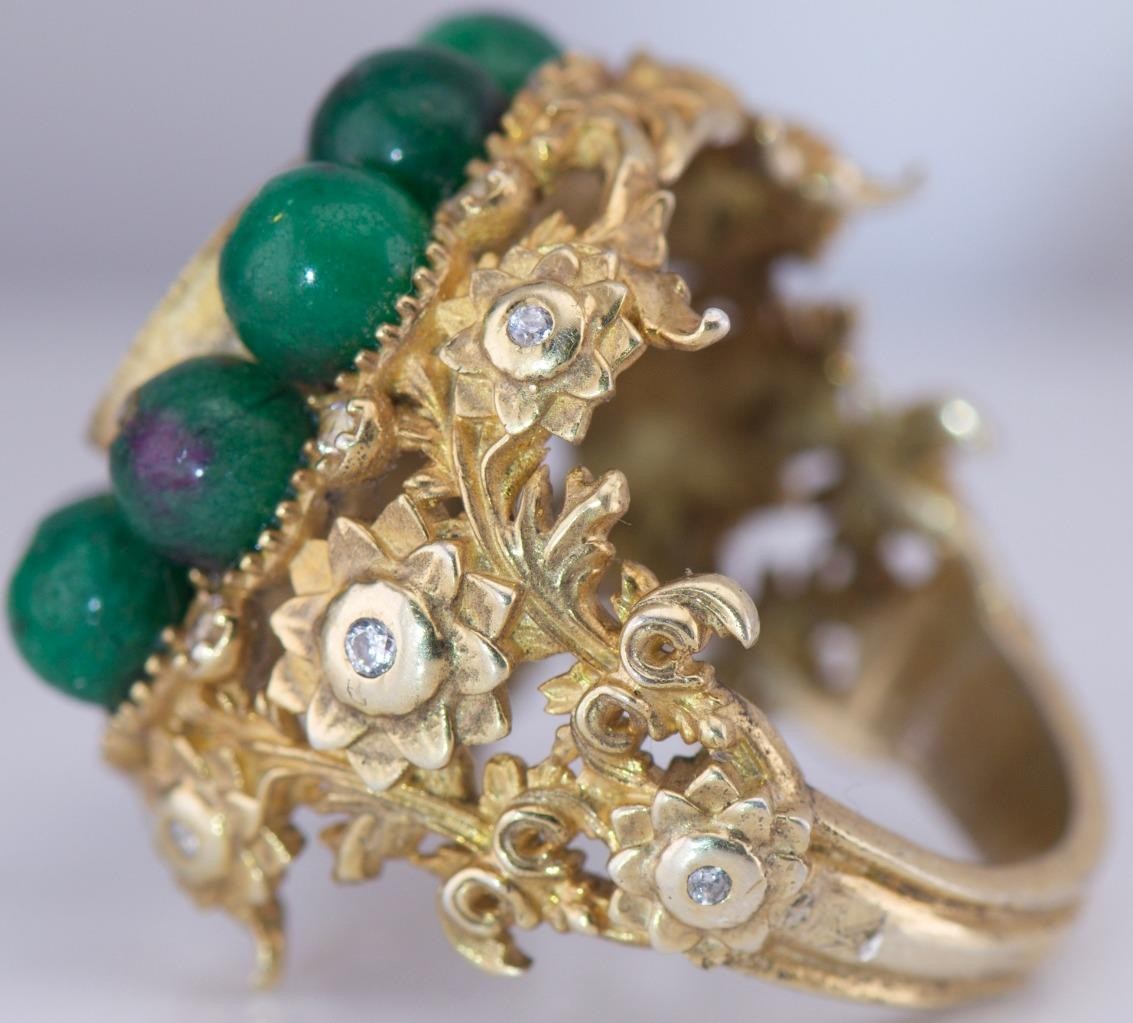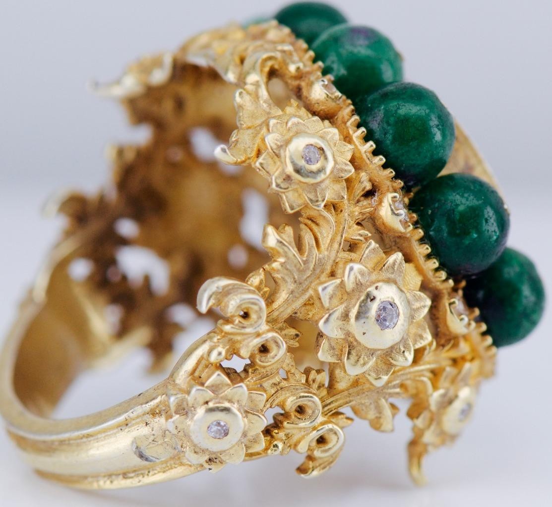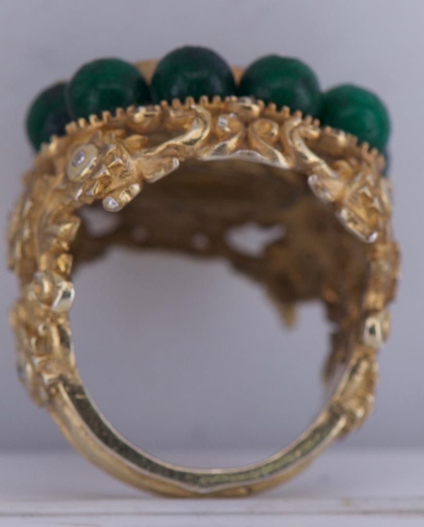 This ring has strong visual presence, substantial gold weight for its type, and exceptional sculptural detail throughout.