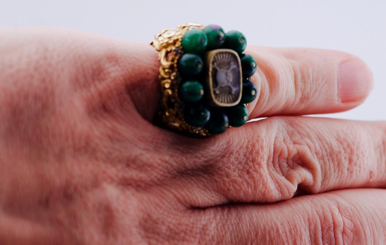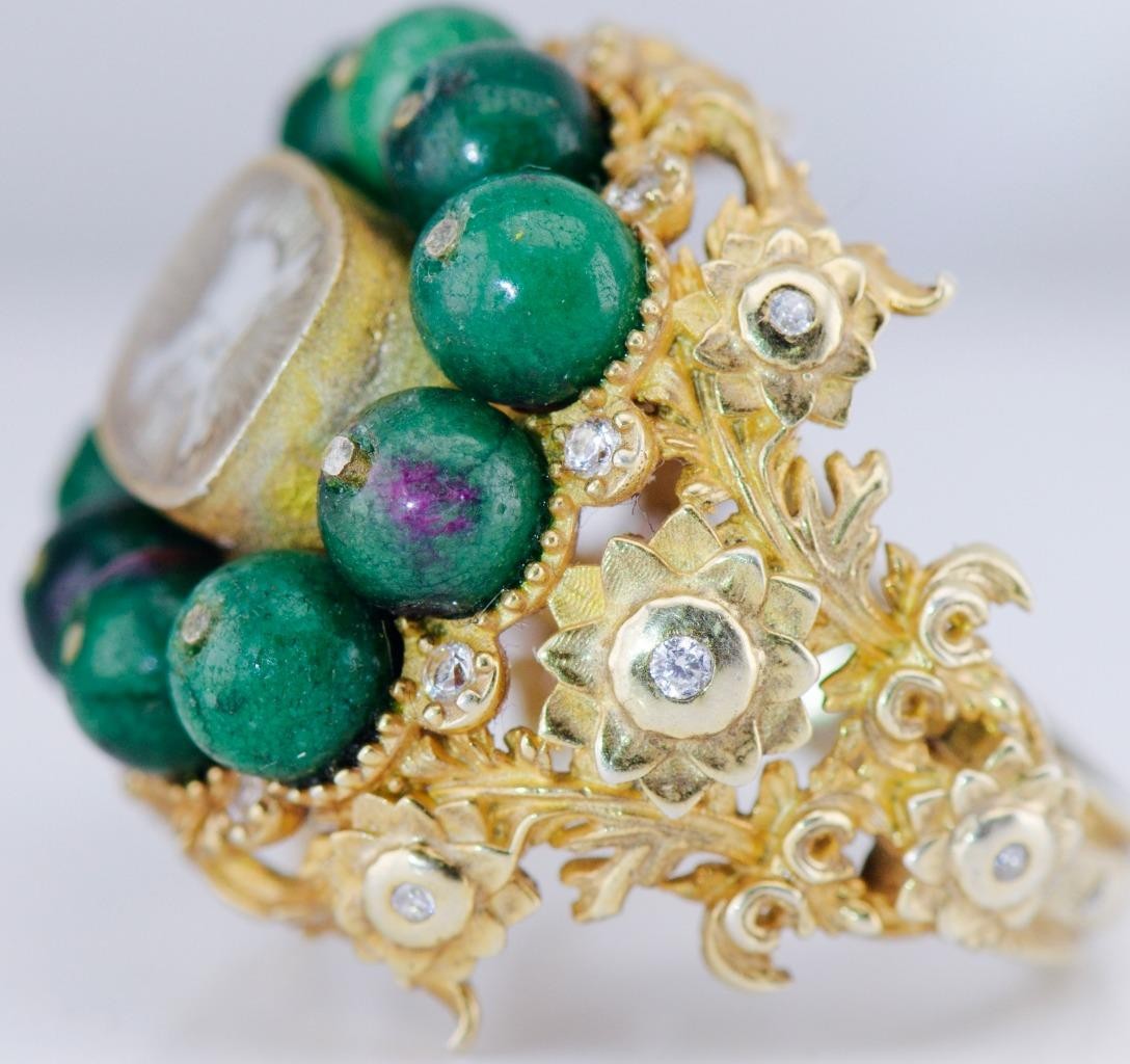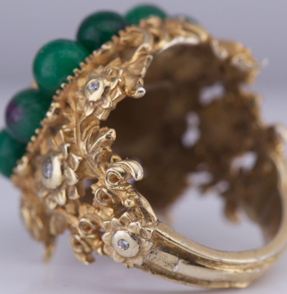 This ring has strong visual presence, substantial gold weight for its type, and exceptional sculptural detail throughout.