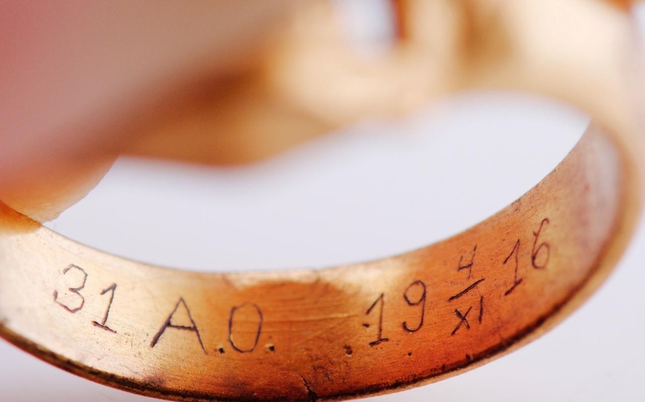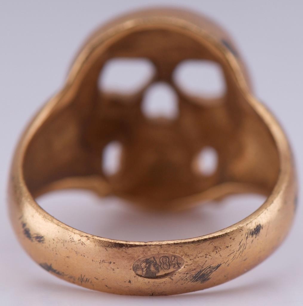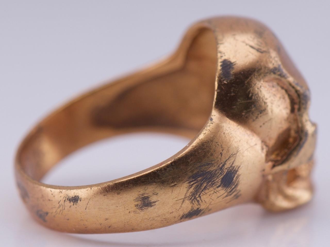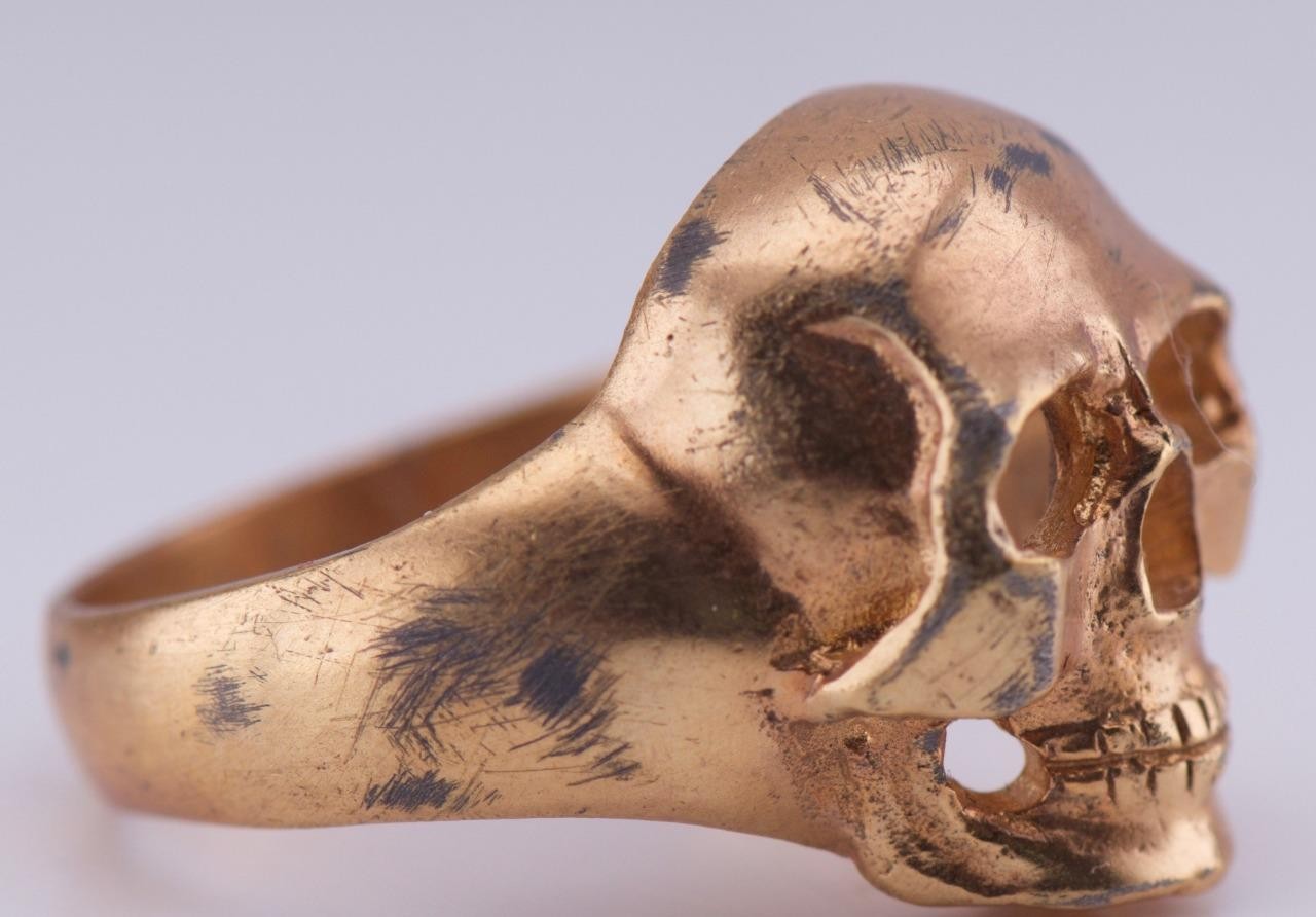 I am pleased to offer from my private collection this rare antique Great War WWI military Imperial Tsar’s Era pilot’s Memento Mori gold plated silver skull ring c1916. The ring has been awarded to an officer from the Imperial 31th Fighter avio Detachment regiment. The skull head was the official symbol of 31th Avio Regiment. The ring is engraved “31 A.O. 4th Nov. 1916”. The ring has been awarded only one month before the Communist Revolution to begin in March 1917 and the fall of Tsar.
