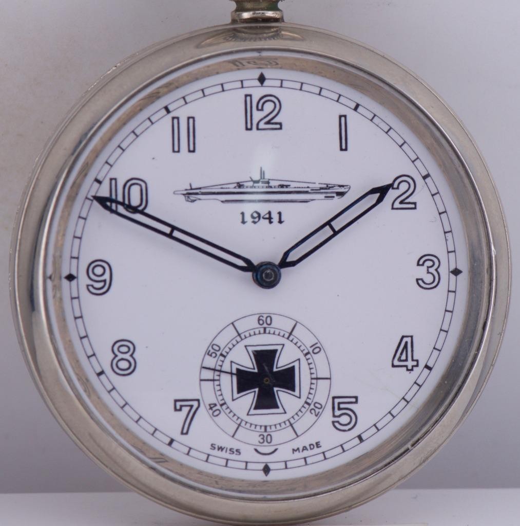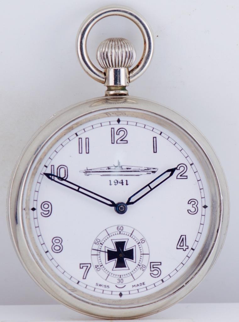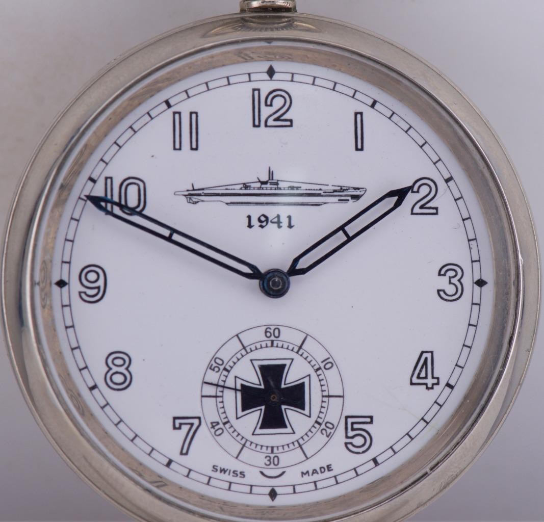 The white enamel-style dial displays bold Arabic numerals for excellent legibility, and a subsidiary seconds dial. Of particular interest is the historical maritime motif on the dial, dated “1941”, reflecting its wartime production period.