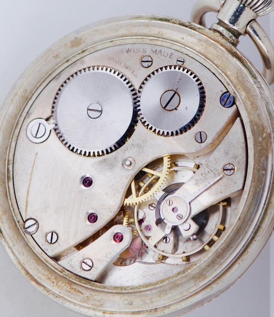 The higher-grade 15-jewel Swiss movement is clean, original, and mechanically sound, housed in a solid metal case with a traditional crown and bow. Movement components show proper aging consistent with an authentic WWII-era watch.