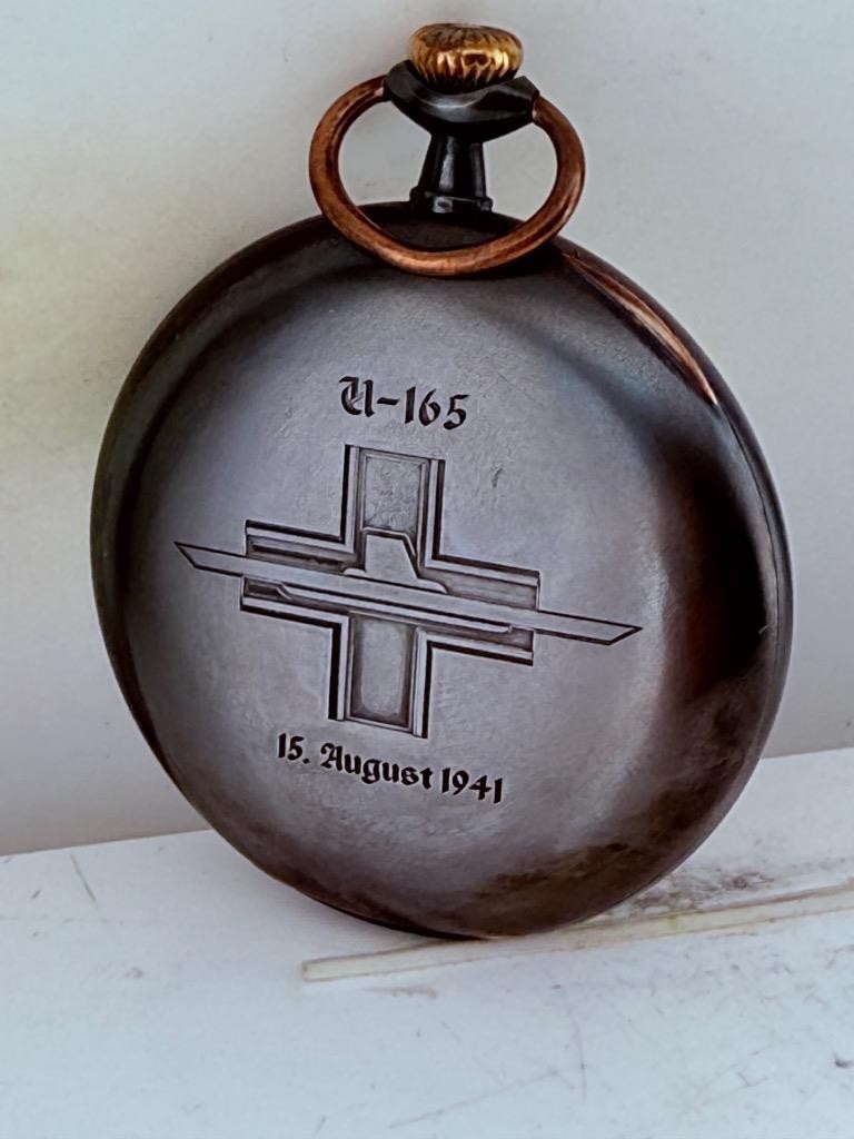 A rare and historically significant antique WWII-era Omega pocket watch, featuring a gunmetal military case engraved with “U-165”, a detailed U-boat depiction, and the date 15. August 1941 framed within an iron-cross style motif.