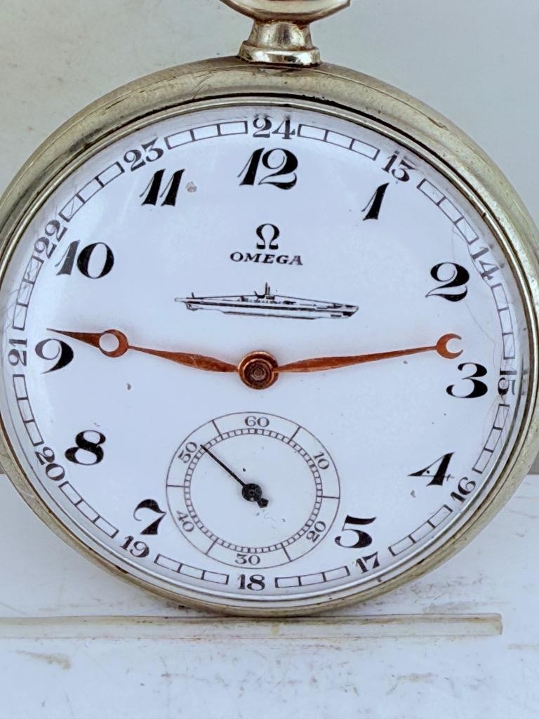 - Case: Silver-tone military-style case, Omega-signed, serial 9487373, approx. 50 mm diameter