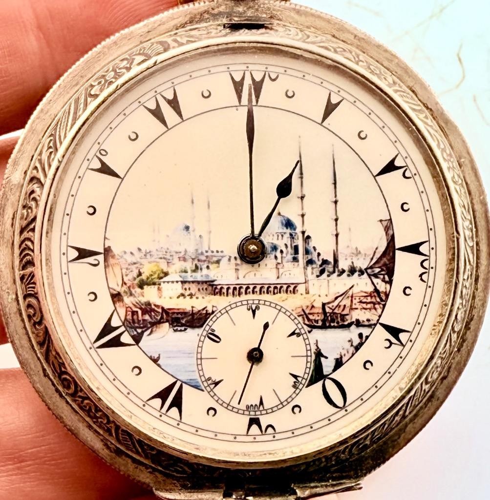An outstanding and rare Zenith Billodes silver pocket watch, crafted for the Ottoman market in the late 19th to early 20th century. This exceptional piece features a fine enamel dial depicting an exquisite view of Istanbul with its iconic mosques and Bosphorus ships, a design reserved for the most prestigious clientele.