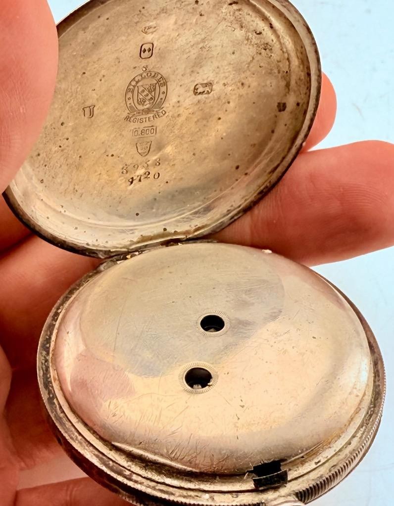 - Hallmarks: Billodes crest, silver 0.800 mark, and serial numbers on the inner cover